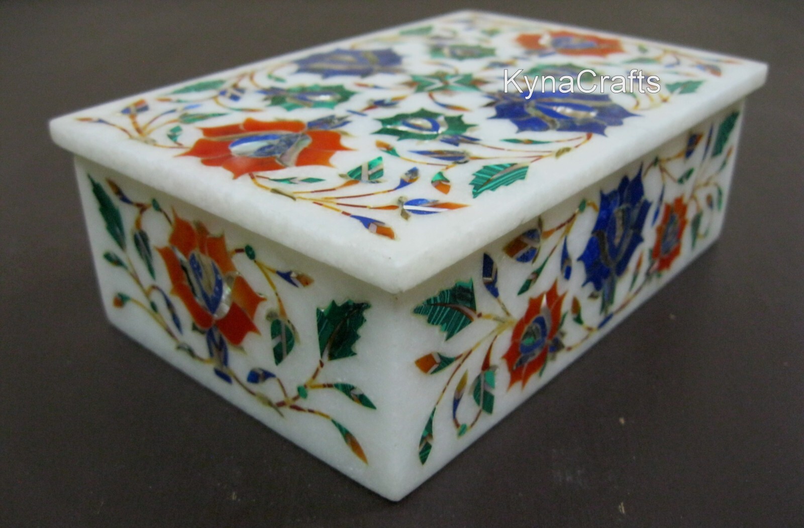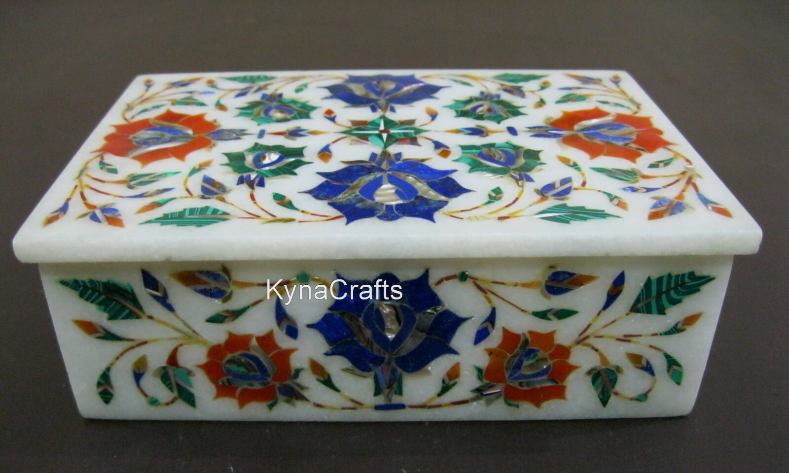 · This elegant and luxurious marble box is a great choice for storing your watches, rings, earrings, ear studs, necklaces, bracelets, cuff links, and brooches etc. · Handcrafted in India with Ancient Inlay Art, by the Skilled Artisans who are descendants of those families who built the Taj Mahal. · It is the perfect gift for your loved one i.e. mother, girlfriend, wife, daughter, colleague, or friend, a good choice as Birthday, Christmas , Wedding day, Valentine's Day, Mother's day, Anniversary Day Gift. · Adds high-style to yours dressing table & wardrobe. · Process of Inlay Art “Inlay work” is one of the most attractive art that done from marble. Same type of that adorns the Taj-Mahal and other Mughal monuments. It is a closely protected traditional art and only a few expert exponents are available today. The delicate process involves cutting and engraving marble shapes manually. To start with, a predefined pattern e.g., floral design or geometrical design is engraved on the marble slab. Small pieces of marble of different shades are cut delicately to fit in these grooves precisely. These small pieces are then slipped in the grooves. There are many varieties of colored stone available for utilization in marble inlay work: malachite, carnelian, jasper, mother of pearl, abalone shell, lapis lazuli, agate, coral, turquoise and tiger eye to name just a few. The grooves are filled with their precisely corresponding shapes of colored stone and secured in place with a white putty made from oil, and wax. Once the design is completely dry, the piece is polished with a mixture of sand, water and emery paper to give a shiny smooth finish. Apart from marble, many other materials can also be used. If You Are Looking Something Customize, Let Us Know We Will Make For You As Per Your Design, Size & Shape. Buyer has to pay Custom Duty or other taxes if any applicable in destination country. No two pieces are exactly alike, as the Gem Stones used have different Color, Pattern & Textures.