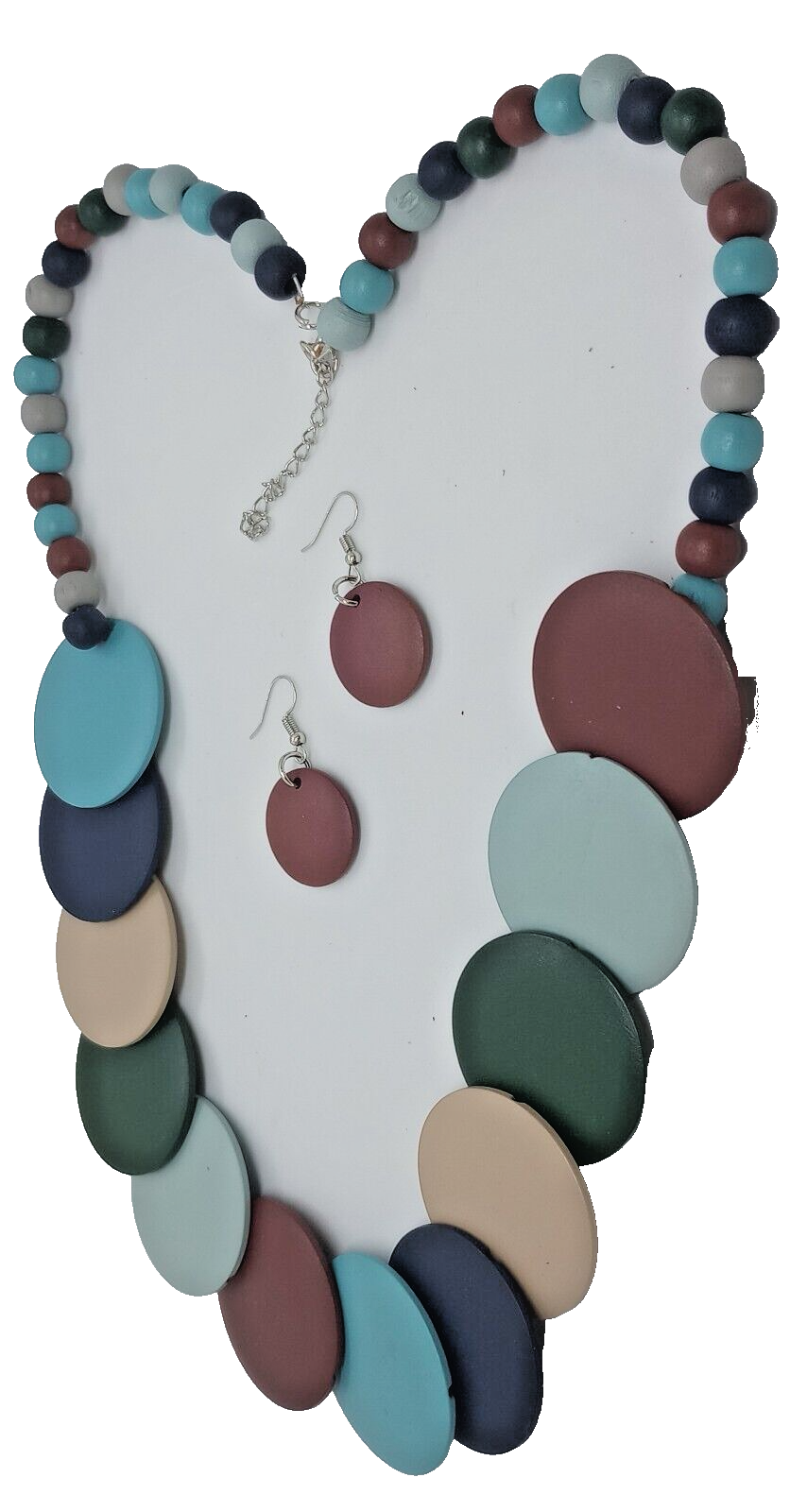 Add a pop of color to your outfit with this beautiful Circular Wooden jewelry set. The set includes a stunning multicolor necklace that is sure to catch everyone's eye. The matching earrings complete the look. Perfect for any occasion, whether it's Mother's Day, Christmas, Graduation, Anniversary, Birthday or Valentine's Day. The set is made with high-quality resin material, and the flat round beads have a lovely multicolor hue. Get this jewelry set as a perfect gift for your loved ones, or buy it for yourself to add a touch of bohemian style to your collection. Necklace Length: 29.5" with 2" extender chain
