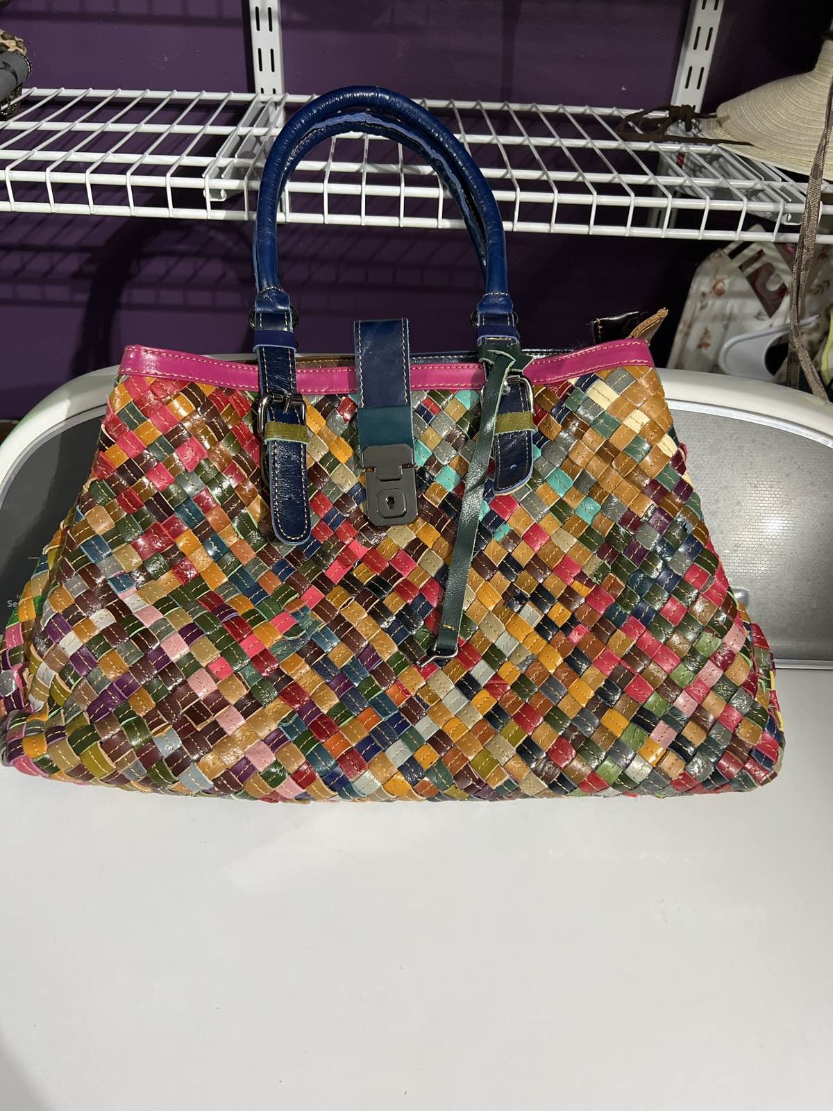 Elevate your everyday style with this striking multicolor woven leather tote. Crafted from supple leather, this handbag showcases a beautiful interwoven design in a captivating array of hues, creating a unique and eye-catching accessory. The artisanal weaving adds rich texture and depth, making this tote a statement piece that complements a variety of ensembles. Designed for both style and practicality, this tote offers ample space for all your essentials, easily transitioning from a daily shoulder bag to a chic carry-all for work or weekend outings. The sturdy construction and comfortable shoulder straps ensure reliable wear, while the thoughtful design details highlight the quality craftsmanship. This previously owned tote is in excellent condition, showing minimal signs of wear and ready to become a cherished addition to your collection. Its versatile design pairs effortlessly with casual and dressier looks, making it a valuable addition to any fashion-conscious individual's wardrobe. Embrace the blend of artistry and function with this distinctive leather tote.