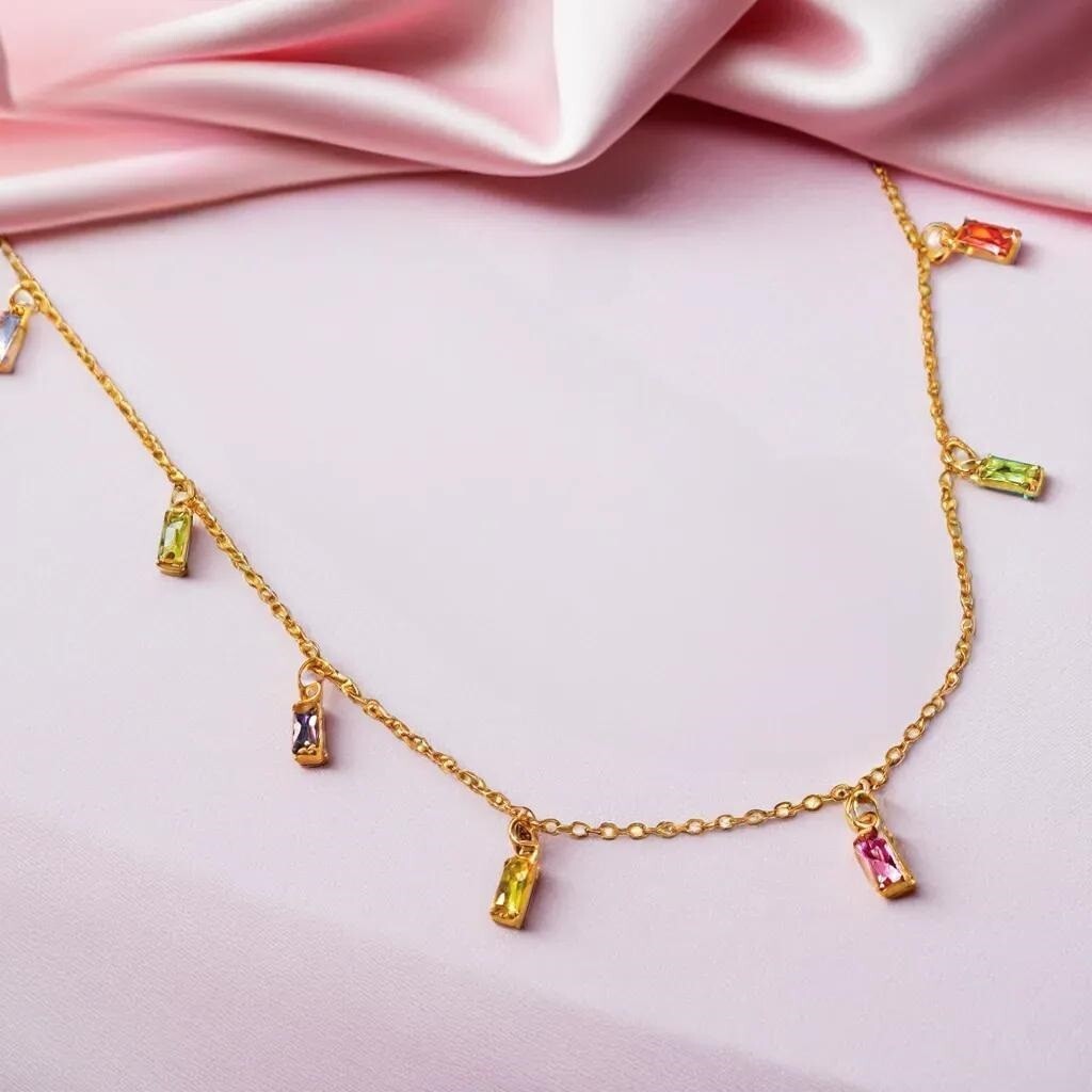 Embrace dainty elegance with this gold-plated cable chain necklace. At 45cm in length, plus a 5cm extender, it features delicate 7.5mm x 2.5mm multicolour square crystal charms that add a subtle sparkle. This minimalist piece is perfect for layering or wearing alone, offering a chic addition to any jewellery collection.