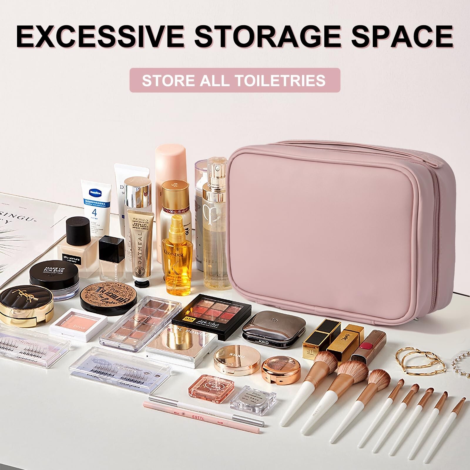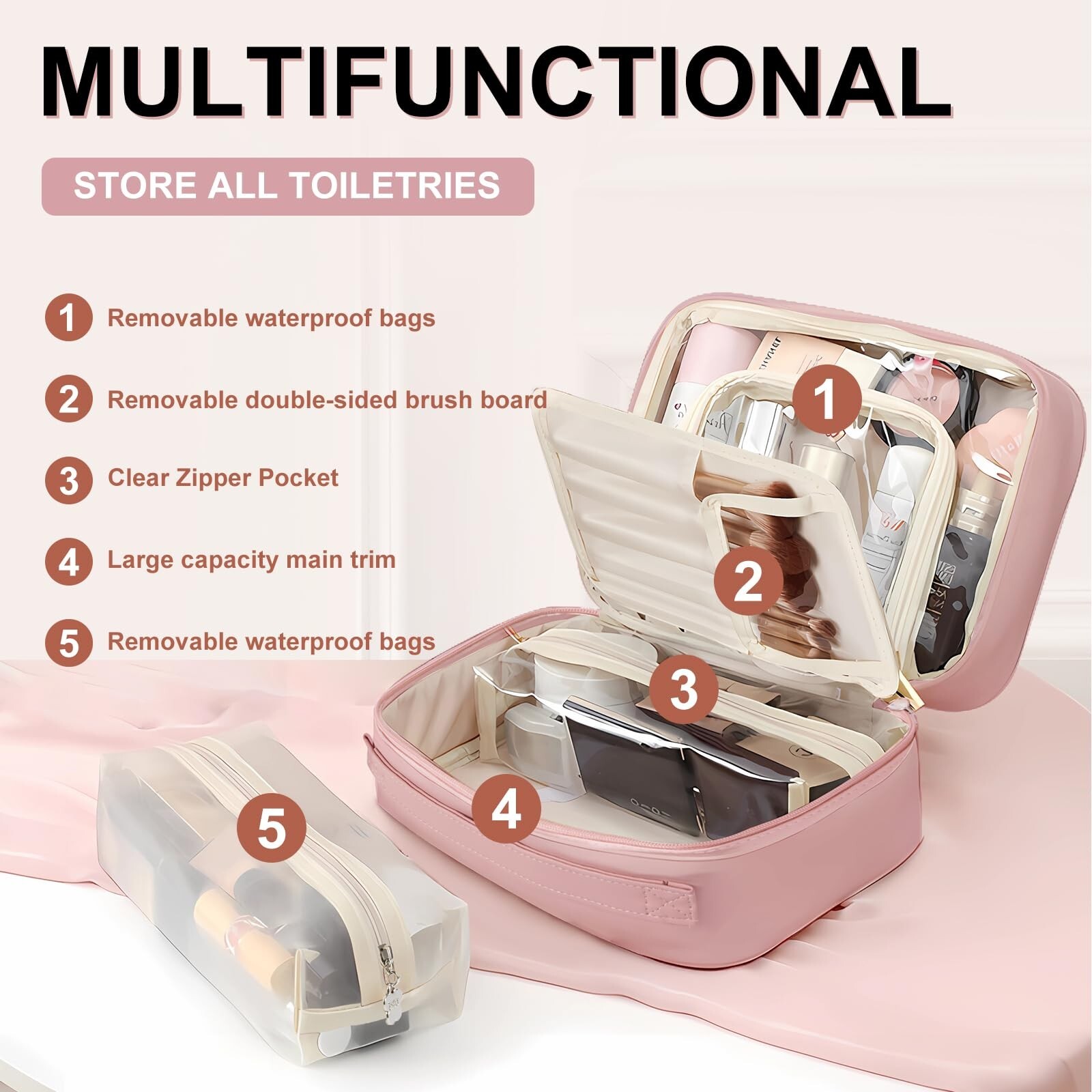 Multicompartment Toiletry Cosmetics Bag,Set Patient Travel Makeup Bag,Travel Toiletry Bag For Women,Travel Organizer For Accessories, PU Large makeup bag with compartments(pink) Product Details Color: pink Brand: YGLCYXK MPN: xsb-001 UPC: Does not apply EAN: Does not apply Product Dimensions: 9.3 x 6.3 x 6.9 inches Item Weight: 1.06 pounds Department: Unisex Manufacturer: YGLCYXK Country of Origin: China Item model number: xsb-001 Multi Compartment Toiletry Cosmetic Bag:This portable makeup organizer bag is designed with convenience in mind, measuring 9.3*6.3*6.9 inches. It features a handy carry handle and offers ample storage space for all your essentials. The bag includes two transparent compartments for organizing your cosmetics and skincare products, as well as a detachable makeup brush holder with you can store a variety of necklaces jewelry, etc Pu Leather Waterproof Cosmetic Bag:travel toiletry organizer is made of durable waterproof PU leather. It is easy to clean and dries quickly in humid environments such as bathrooms or shower areas. The excellent streamlined jointing process maintains the intact toiletry bag shape and provides excellent protection. Fashion and beauty without compromising durability. Suitable for your daily use or family outing pack all the toiletries Multipurpose Multifunctional In One Toiletries Bag For Men And Women:This bag can be used not only as a toiletry travel bag but also as makeup organizer bag, a shower bag, a cosmetic travel bag, a shaving bag, travel bag for toiletries, hygiene kit bag, etc. It is an excellent choice for business trips, travel, fitness, camping, home use, etc. It is also a must-have for travelers, business people, and outdoor sports enthusiasts Keep Everything Organized:Large wash bag is a must have for you travel ,No more worrying and distressing about limited space .Let your toiletries are no longer having a riot and are locked in individual secure units, No longer a mess on the bottom of the bag. Make you travel handy and organized Easy to Clean: This waterproof cosmetic bag is simple to wipe down, making maintenance a breeze. Keep your bag looking new and fresh with minimal effort, so you can focus on enjoying your travels