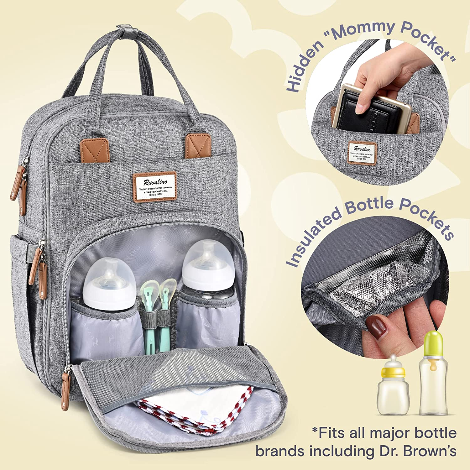 polyester Imported Only sold exclusively by authorized retailers RUVALINO-US. What you'll get - 1 normal size backpack diaper bag with changing pad (dimension: 11.8l x 7.8w x 16.5h inches, Weight: 1.78lb; Mat Size: 23l x 15w inches). Two big zipper closure compartments and 16 pockets, Spacious enough to hold most of baby essentials and still look perfectly organized and compact, without being too large or too small. Insulated bottle pockets can hold most of wide neck or tall baby bottles, from 5 oz to 11oz. Upgrade Handy Construture - The interior of our diaper bag includes a padded laptop pocket, mesh pocket organizers and other organization essentials. Maintain the temperature of your baby bottles in the insulated pockets, never lose your keys and wallet in the mommy pocket, and quickly grab a diaper out of the mesh diaper organizer. Designed for Convenience - Extra wide opening makes this diaper backpack easy to find essentials in a pinch, and dual zippers for easy-access & closure even with one hand! Easy-grab handle & back ergonomic design & thick padded shoulder straps offer you a comfortable carrying and of force reinforcement. Convertible and Versatile - This diaper bag can be worn as a backpack, handbag, or hung on the stroller. Its minimalist design exudes a timeless charm and makes it suitable for many occasions like shopping, traveling etc. Moreover, the practical and gender-neutral design makes this diaper bag backpack perfect for travel with your boys & girls, an ideal baby shower gift! Durable that'll last for years - Our diaper backpack is made of lightweight, durable and waterproof fabric (Stronger than twill polyester baby bag, better in deform resistance & tear resistance). Non-fraying stitching, and strong zippers. Reinforced seams in shoulder straps and handle, without ripping. Product Description