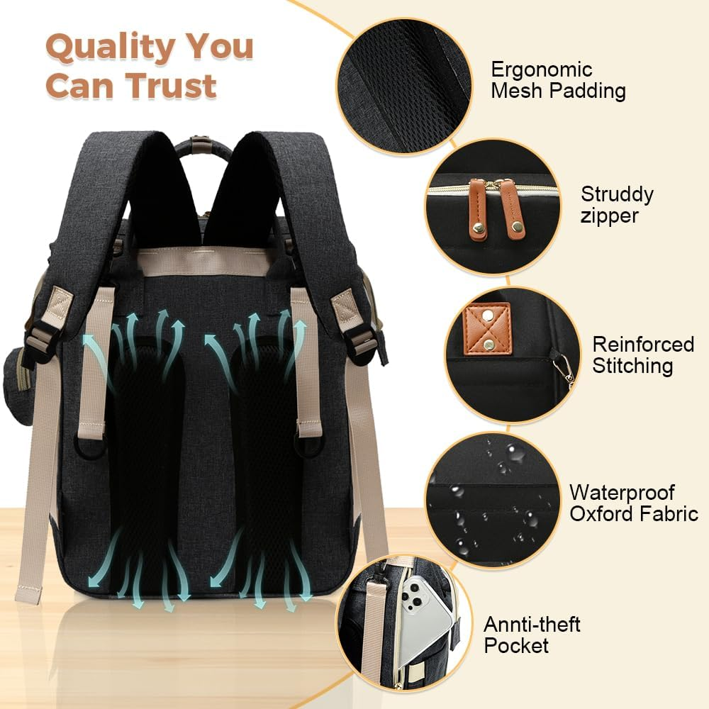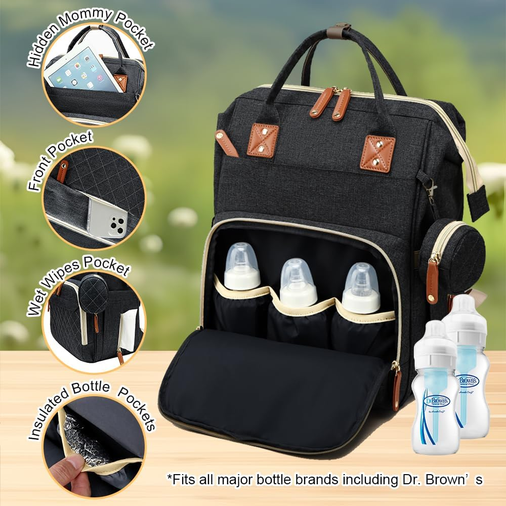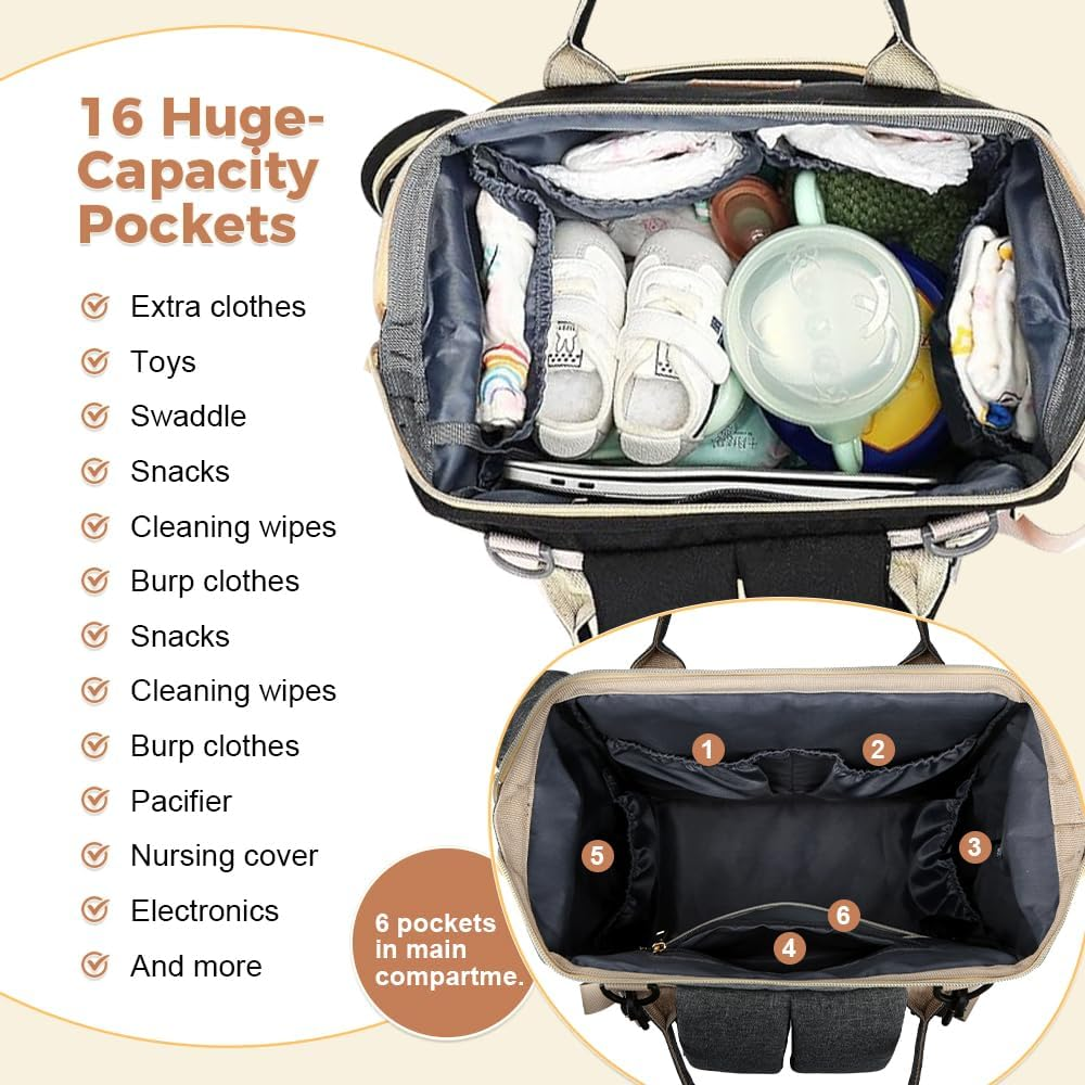 Perfect Baby Shower Gifts! Your Baby Registry Search ends here!You'll Get - A large diaper backpack(size:13”×7.5”×17.5”),stroller straps,and a pacifier holder. Tons of Storage – HONGYICHAO baby diaper bag has tons of spaces to hold baby essentials, plus some for mom and dad! Two big zipper closure compartments and 16 pockets, spacious enough to hold most of baby essentials and still look perfectly organized.The main pocket holds tablets and laptops up to 15.6" and also has one wet pocket .Insulated three bottle pockets can hold most wide neck and tall baby bottles. Designed for Convenience - Extra wide opening makes this diaper backpack easy to find essentials in a pinch.Easy-grab handle & back ergonomic design & thick padded shoulder straps offer you a comfortable carrying and force reinforcement.With one charging port which can make your phone or ipad charge more comfortable. Durability to last: Our maternity backpack diaper bag is crafted from lightweight and waterproof polyester fabric. Includes spill-resistant and easy-to-clean lining. You don't need to fear spilled milk or water. Convertible and Versatile - This diaper bag can be worn as a backpack, tote bag, handbag, or hung on the stroller. Its minimalist design exudes a timeless charm and makes it suitable for many occasions like shopping, traveling etc. Moreover, the practical and gender-neutral design makes this diaper bag backpack perfect for travel with your boys & girls, an ideal baby shower gift! Product Description mummy diaper backpack bag large diaper backpack bag for keeping your baby items organized diaper backpack bag with multiple pockets