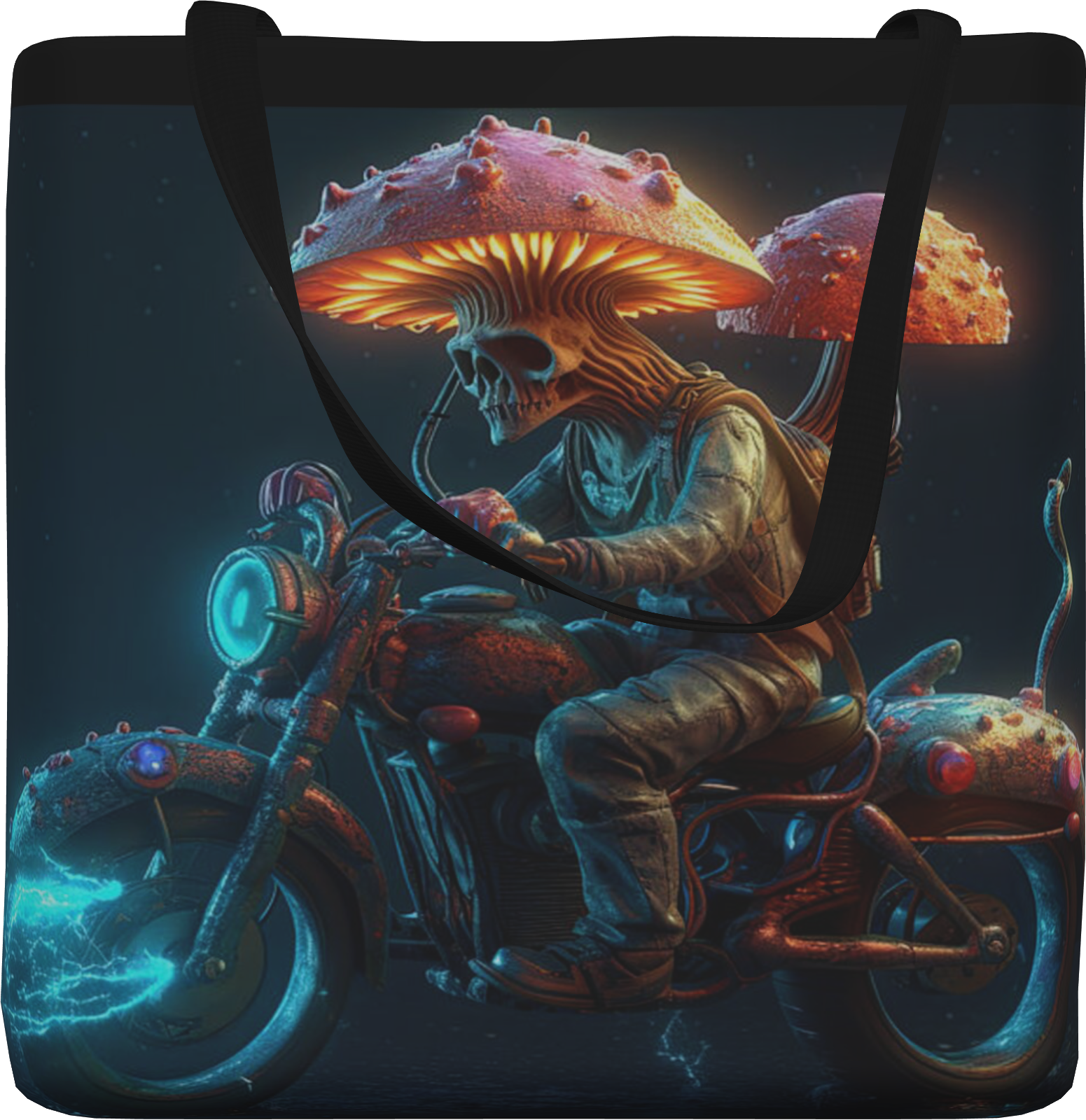 UP FOR SALE A tote bag featuring the digital art " Mushroom Cap Crusader: A Luminescent Voyage ". Our tote bags are made from soft, durable, poly-poplin fabric and include a 1" black strap for easy carrying on your shoulder. All seams are double-stitched for added durability. Each tote bag is machine-washable in cold water and is printed on both sides using the same image. CONDITION: New With Tags. We inspected the item to make sure that you will receive the item/s in the conditions as stated above. Colors, vibrancy and alignment may slightly differ from the pictures in this listing. ABOUT THIS PRODUCT'S UNIQUE ARTWORK: In the luminescent thrum of an otherworldly night, an enigmatic figure forges a path unknown atop a motorcycle that seems to pulse with a life of its own. This isn't any ordinary traveler; their head blooms into a magnificent mushroom cap, bioluminescent and wise, suggesting a symbiosis of nature and the supernatural. Tentacles unfurl with an ethereal glow, caressing the controls as if the bike and rider share one mind. The atmosphere crackles with electricity, painting the dark with streaks of blue energy that hint at speeds beyond imagination. This stunning tableau not only blurs the lines between organism and machine but invites you into a saga where the very fabric of reality is as malleable and vibrant as the mysterious rider's next destination. We use Pixels fulfillment service to ship this product with our unique artwork on it. Colors and vibrancy may slightly differ from the pictures in this listing. Item will ship within 3 to 4 Business Days. Please let us know if you have any questions before purchasing the item. ___________________________ ABOUT RETURNS & REFUNDS We use eBay's 30-day Return Policy to facilitate the process. If you decided to return the item, eBay's website will guide you, step by step, throughout the return process. It's important that you read eBay's Return Policy and eBay's Condition of Returned Items Policy before returning the item. Please be as descriptive as possible when contacting us. If you would like a refund for the cost of the item you purchased, you will need to return the item to us first. No refunds will be processed until the return item is received. There will be a 50% deduction from the refund if the item is not returned in accordance to eBays' Condition of Returned Items Policy.