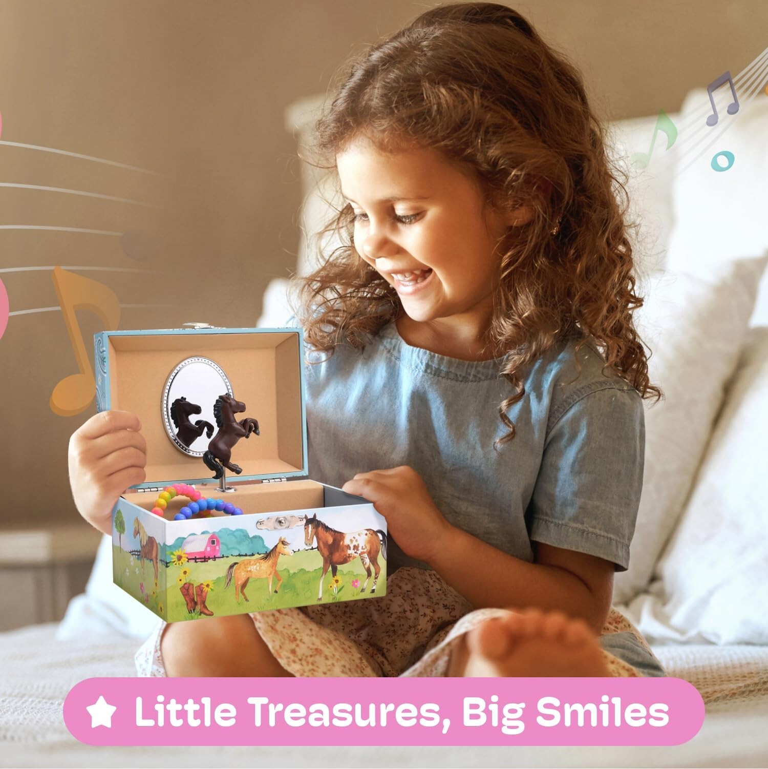 Jewelry Box for Girls by Jewelkeeper - Barn Design Musical Jewelry Box with Spinning Horse Doll - Pony Stuff for Girls, Horse Gift for Kids, Equestrian Keepsake for Ages 2 Up - Home on The Range Tune Product Details Color: Blue and Green Brand: Jewelkeeper Material: Engineered Wood Style: Horse Special Feature: Organize Little Girls Jewelry Recommended Uses For Product: Necklace, Bracelet, Ring, Earring Product Dimensions: 5.25"D x 7.15"W x 3.9"H Target Audience: Girls Shape: Rectangular Occasion: Birthday Is Discontinued By Manufacturer : No Product Dimensions : 4.25 x 5.91 x 3.39 inches; 5.6 ounces Manufacturer recommended age : 3 years and up Item model number : A1329 Date First Available : September 30, 2018 Manufacturer : Jewelkeeper Country of Origin : China Best Sellers Rank: #80,548 in Clothing, Shoes & Jewelry (See Top 100 in Clothing, Shoes & Jewelry) #12 in Children's Jewelry Boxes #12 in Children's Jewelry Boxes Store Precious Treasures: Childs horse jewelry box with spinning horse toys, provides charming storage for kids jewelry; ample space for necklaces, bracelets, earrings, and keepsakes; perfect for organizing and protecting treasures Magical Gift Idea: Equestrian gifts for 3 year old girls; imagine the joy on her face as she opens this horse jewelry box; horse gift for little girl with a spinning horse doll twirling to the soothing Home on the Range tune Charming Room Decor: Farm animal jewelry box doubles as delightful room decor; complements pony stuff for girls and horse decorations; also makes adorable horse party favors; a beautiful addition to any horse-themed room Ideal Size and Design: Boy musical jewelry box and girls organizer; measures 6 x 4.65 x 3.5 inches when closed; compact yet spacious design; ideal for toddlers and young children to store their favorite jewelry and small treasures Joyful Keepsake: Horse gift for little girl designed to be a treasured keepsake; this charming jewelry box offers a delightful way to store precious items; a memorable gift that adds magic to any little girls collection