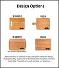 Design: Personalized Mustache Cutting Board or Charcuterie Serving Tray All items ship via USPS - please make sure your address is correct :-) Whether used as a charcuterie serving tray for snacks or cutting board, our bamboo, walnut and cherry custom boards are the perfect addition for the home and make the perfect gift for your loved one celebrating a birthday, anniversary, new home, wedding, etc! *** FEATURES *** • SIZES: We have multiple styles and sizes available. To see our current sizes available, click the drop-down menu. The photo slide contains a photo showing each side by side. Please note, the board with the juice groove only has the groove on the front side of the board. • THICKNESS: Bamboo Boards - Approximately 1/2" Thick; Walnut & Cherry Boards - Approximately 3/4” Thick • UNIQUE: Every board is unique with the grain and coloring varying throughout - no board is the same! • CARE INSTRUCTIONS: Hand wash only with warm water. Do not soak. Please apply mineral oil throughout the board’s life. • PERSONALIZATION/CUSTIMIZATION: Do you want the text placed differently on the board? Please don’t hesitate to contact us. All personalization notes can be entered in the personalization box when checking out. • SHIPPING: All cutting boards ship within 2 to 5 business days. • WHOLESALE ORDERS: Please don’t hesitate to contact us for information about wholesale orders. Processing times for larger orders may change. • NOTE: Colors can vary a bit on different monitors and screens. Any props included in photos are not included. Please be sure to double-check your address to make sure it is accurate for USPS delivery. If a package is returned to us due to an invalid address, the buyer is responsible for all additional shipping charges. We appreciate you supporting small business – best wishes! For items ordered with simple edits, we do not send proofs since the layout doesn't change from the example(s). However, in the event there are requests that change the layout from the example(s), we do send proofs for approval before making the product. If you'd like a proof before we make the product, please note so in the personalization box.
