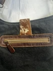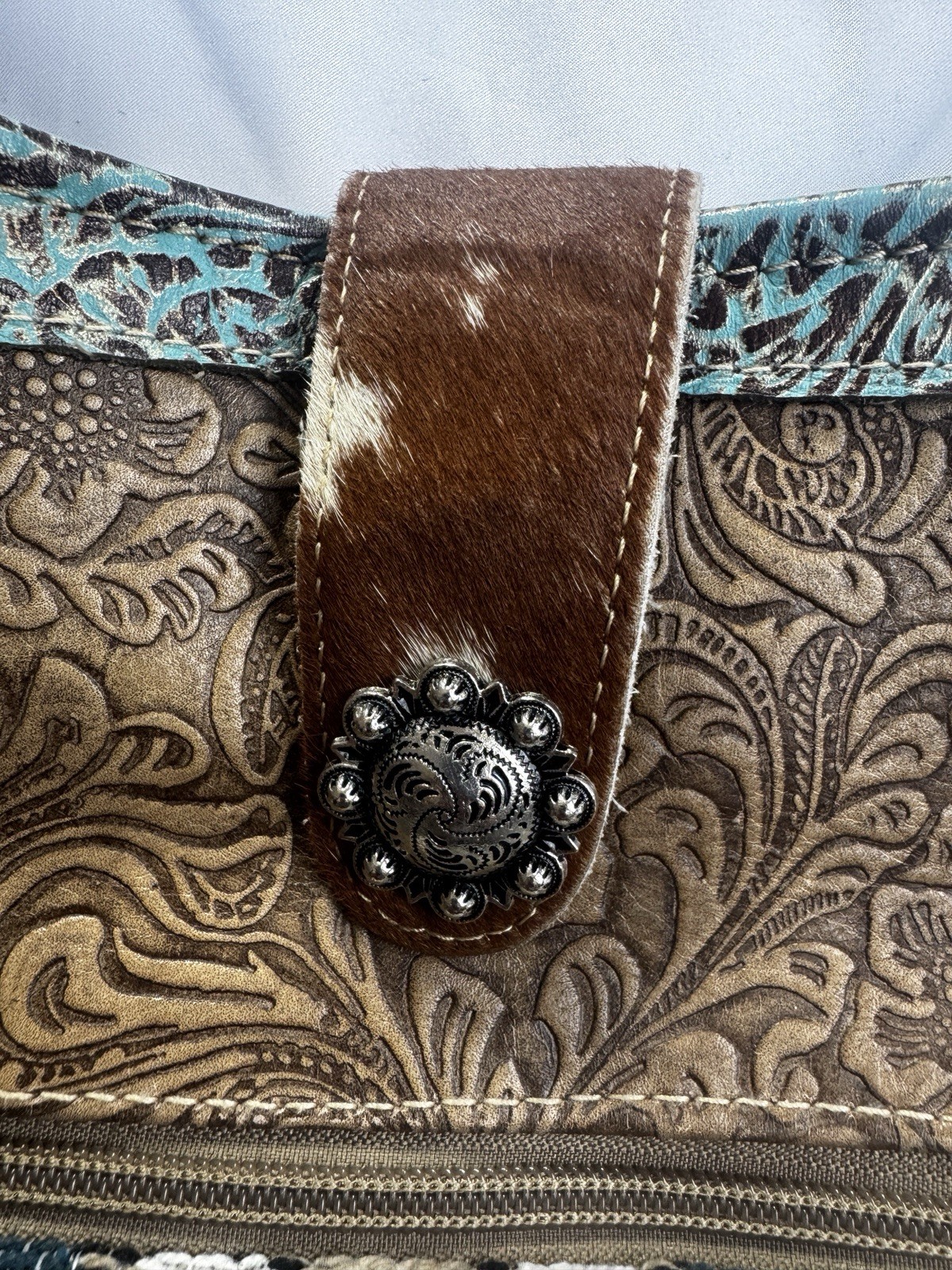 The Myra Bag Boho Western Shoulder Bag is a stylish medium-sized rectangular shoulder bag made of cowhide and tooled leather with an Aztec pattern. It features a zip and snap closure, brown canvas shoulder strap, gunmetal hardware, and inner pockets. The bag also includes a detachable strap and is perfect for casual occasions, adding a touch of cowgirl character to any outfit. The multicolor exterior and Aztec pattern give it a unique and trendy look, while the leather lining and brass hardware add a touch of quality and sophistication to this fashionable accessory.