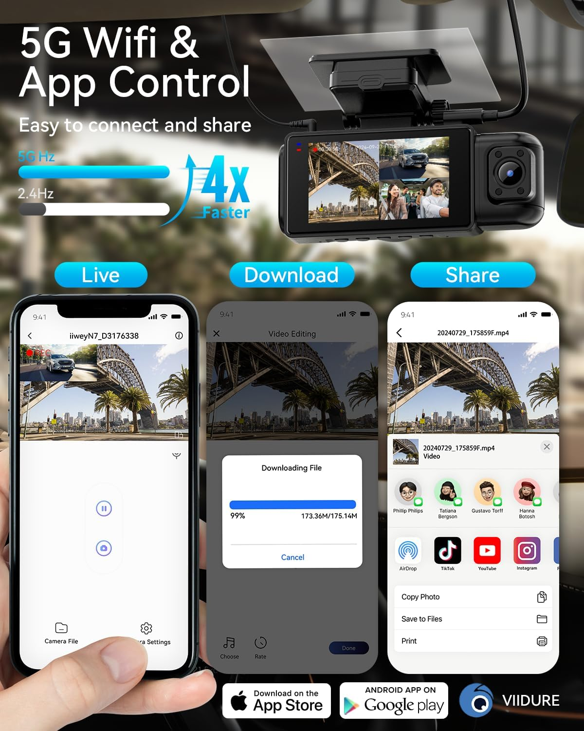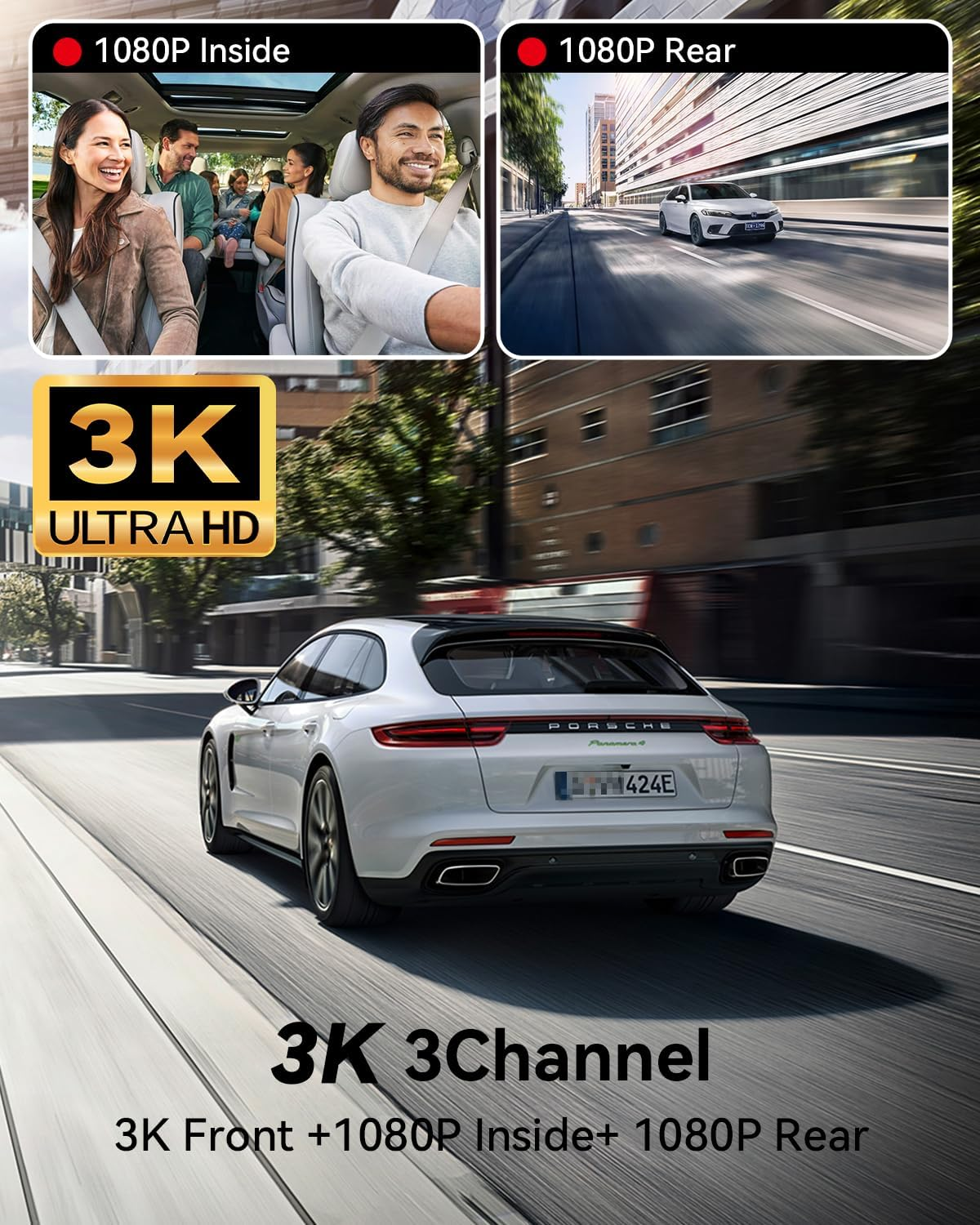 【3-Channel Dash Cam with 3K+1080P+1080P】This 3 channel dash cam features an industry-leading SONY IMX sensor and processor, delivering smooth, high-definition video. With simultaneous 3-channel recording, it offers 3K (2880x1620) front, 1080P (1920x1080) inside, and 1080P (1920x1080) rear resolution for comprehensive protection. The 170° wide-angle front, 150° inside, and 170° rear cameras eliminate blind spots, ensuring full coverage. Perfect dash cam front and rear inside 24/7 recording. 【5G WiFi & Easy Phone Connection】Enjoy high-speed 5G WiFi for ultra-fast downloads, reaching speeds up to 8MB/s (compared to just 2MB/s with 2.4GHz WiFi). Stream live video from your dash camera for cars seamlessly on your phone, adjust camera settings, download footage, and share videos effortlessly on platforms like Instagram, YouTube, and Facebook. 【4K & 1080P Front and Inside Dual Dash Cam】In dual recording mode, the cam offers a 4K 2160P resolution front camera and a 1080P inside or right camera. The inside camera features a fully adjustable 180° rotatable lens, making it adaptable to various needs. The front camera records in stunning 4K, ensuring clear visibility of license plates and road signs. Note: The rear camera should be removed when using 4K + 1080P resolution. 【Peregrine Falcon Night Vision & Rotatable Right Lens】The front camera uses Sony’s STARVIS sensor, along with HDR and WDR technology, to capture clear video even in low-light conditions. The rotatable inside camera features 4 IR lights for black-and-white night vision, ideal for a side camera for car setup or as an Uber camera inside car. The rear camera records in 1080P, offering reliable evidence collection in all scenarios. 【Seamless Loop Recording & Reliable Accident Documentation】The iiwey N7 supports seamless loop recording, automatically overwriting the oldest footage when the memory is full. Paired with a built-in 3-axis gravity sensor, it locks critical footage during significant impacts. The included 128GB SD card, a must for high-performance dash cams, ensures you have ample storage for your journeys. 【128GB Industrial U3 SD Card Included】The iiwey N7 dash cam comes with a pre-installed 128GB Industrial U3 SD card, so there’s no need to purchase additional storage. This high-speed SD card is specifically designed to support the demands of high-end dash cams, ensuring smooth performance without interruptions. With double the storage capacity of a 64GB card, the 128GB SD card allows you to store more footage, providing ample space for important evidence. 【24-Hour Parking Mode】The dash cam is equipped with a low-bitrate parking mode that enables continuous recording while the vehicle is parked, optimizing storage by reducing video quality. Additionally, the collision detection parking mode automatically triggers recording when an impact is detected. For continuous operation, the 3-channel dash cam must be connected to a hardwiring kit (sold separately, ASIN B0DHJNRPB9). 【Built-in Supercapacitor for Enhanced Durability】The dashboard cam features a high-quality supercapacitor, providing stable power and an extended lifespan. Designed to withstand extreme temperatures, it operates efficiently in conditions ranging from -4°F to 167°F, making it ideal for both hot and cold climates. Unlike traditional lithium-ion batteries, the supercapacitor ensures reliable performance and a longer lifespan without the risks associated with battery degradation. 【Easy Installation & Convenient Operation】The dash cam is designed for straightforward installation and operation. With a user-friendly interface and clear instructions, even beginners can easily mount the 3-channel cameras on the windshield and secure the wires. The included 128GB SD card allows for plug-and-play use, eliminating the need for an additional purchase. Additionally, the N7’s car charger features a USB port, enabling you to charge your phone or other devices. 【Dedicated Customer Service】Every iiwey dash cam comes with 24/7 technical support and a 12-month maintenance plan. Our dedicated after-sales team is always ready to assist with installation or any technical inquiries. Starting this year, we ensure timely support during working hours and guarantee a response to all messages within 24 hours, even during holidays. Additionally, we offer a 12-month warranty, providing you with peace of mind and ensuring long-term customer satisfaction. Product Description The video showcases the product in use. The video guides you through product setup. The video compares multiple products. The video shows the product being unpacked. 1 3K+1080P+1080P 2 4K+1080P 1 Continuously Recording 2 Gravity Sensor 3 Two Parking Mode 1 5Ghz Wifi 2 Super Capacitor 3 128GB SD Card 1 Package List 2 Easy Installation I want to use the 24/7 Parking monitor function, should we buy a separate hardwire kit ? Yes, the hardwire kit is not included in this dash cam product. You need to purchase an additional hardwire kit ( (Asin:B0DHJNRPB9) . It enables the activation of a 24/7 parking monitor and time-lapse function. Why are the videos recorded by the right cameras sometimes black and white? The right cam features 4 IR lamps that automatically activate infrared mode in low light or darkness, ensuring clear black-and-white recordings and capturing details like license plates and faces better. Why the SD card is not in the package? The SD card is already inserted inside the dash cam for the convenient of using. What capacity of SD card can this Dash cam support? N7 is compatible with 32GB-256GB memory cards, U3 and 10x or faster SD cards are recommended, and a 128GB memory card is included in the package for free. Do I need to format the SD card immediately after receiving the product? Our SD cards have been formatted before leaving the factory. If there is no formatting prompt when you turn on the dashcam, you can use it directly. However, when using other n