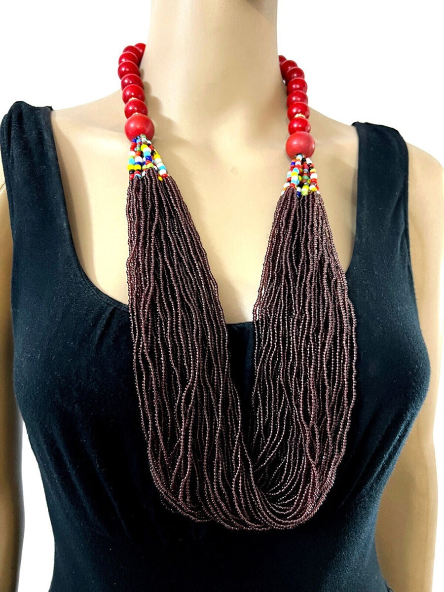 USPS No long wait Product SHIPPED FROM the USA Just 5 to 6 days delivery time at a competitive price. OFFER ME THE PRICE Tribal Multi-Color Strand Long Handmade Necklace This stunning ethnic necklace features 48 strands of Naga glass beads, interspersed with wood and brass-tone beads, all handcrafted in India. It’s finished with a distinctive bovine bone piece at the closure, adding a touch of authenticity and charm. Length: Approx. 33.5 inches (end to end) Materials: Bovine bone, glass, wood, brass-tone beads Color/Tone: Multi-color with brass accents Weight: Approx. 230 grams Style: Versatile as ethnic tribal jewelry or casual fashion accessory Note: As a handmade item, size and appearance may vary slightly Embrace the rich cultural heritage and vibrant style with this eye-catching necklace! This versatile necklace can be worn as a statement piece of ethnic tribal jewelry or as a casual accessory. Each handmade piece is unique, so size and design may vary slightly. Brand new and expertly crafted, this necklace is a distinctive addition to any jewelry collection. An ideal gift for the upcoming holidays, blending cultural richness with contemporary style. Please note that due to the handmade nature of the product, sizes may vary slightly. Buying handmade products comes with a range of benefits that can be quite compelling. Environmentally Friendly : Handmade items generally have a lower environmental impact compared to mass-produced goods. They often require fewer resources and less energy to create. Additionally, small-scale production usually involves less waste and fewer pollutants. Better for the Economy : Purchasing handmade products supports local artisans and small businesses. This not only helps create jobs but also keeps money within the community, which can contribute to a more robust local economy. Purchases You Can Feel Good About : Buying handmade can give you a sense of satisfaction knowing that your purchase supports individual creators and ethical practices. It often involves fair trade practices and contributes to sustainable economic development. You Will Feel the Human Touch : Handmade items often carry a unique personal touch that mass-produced items lack. The craftsmanship and attention to detail in handmade products reflect the skill and passion of the maker, making each piece distinct and special. Value Over Time : Handmade products, particularly those that are well-crafted, can appreciate in value over time. For example, antiques or heirloom-quality items often gain sentimental and monetary value as they age, making them potentially valuable investments. Overall, choosing handmade products can lead to a more thoughtful, sustainable, and rewarding shopping experience. FOR WHOLESALE CONTACT US N7588/JFA-HQ/D) R USA 7/10/2024 Sec D