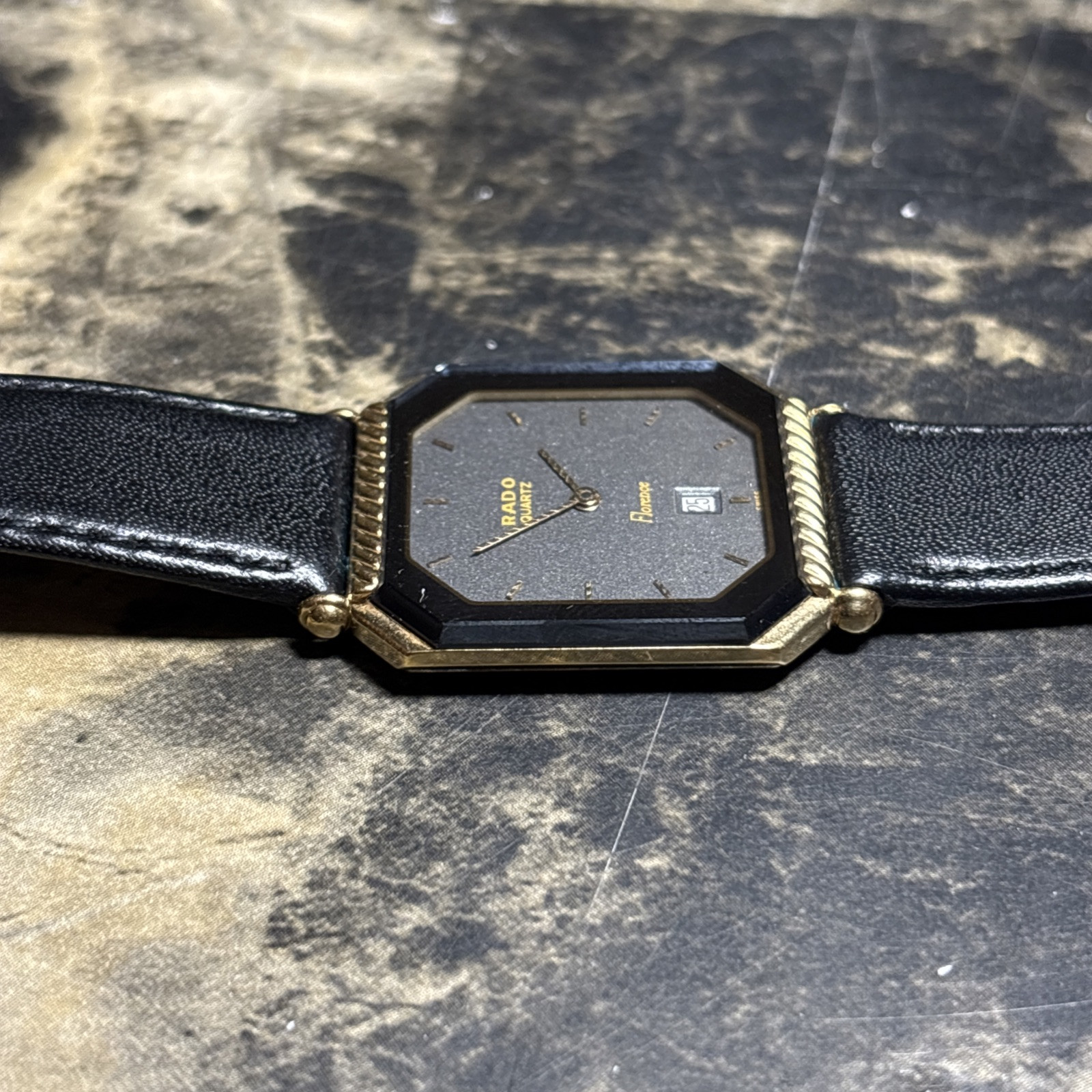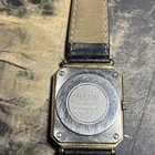 This is a Rado Florence wristwatch for women, with a square gold and silver stainless steel case and a black dial. The watch features round indexes and a 12-hour dial, and is powered by a quartz movement. It is not water-resistant and does not come with a seller warranty or service records. The watch comes with its original box and papers, and has a vintage look. Battery not included