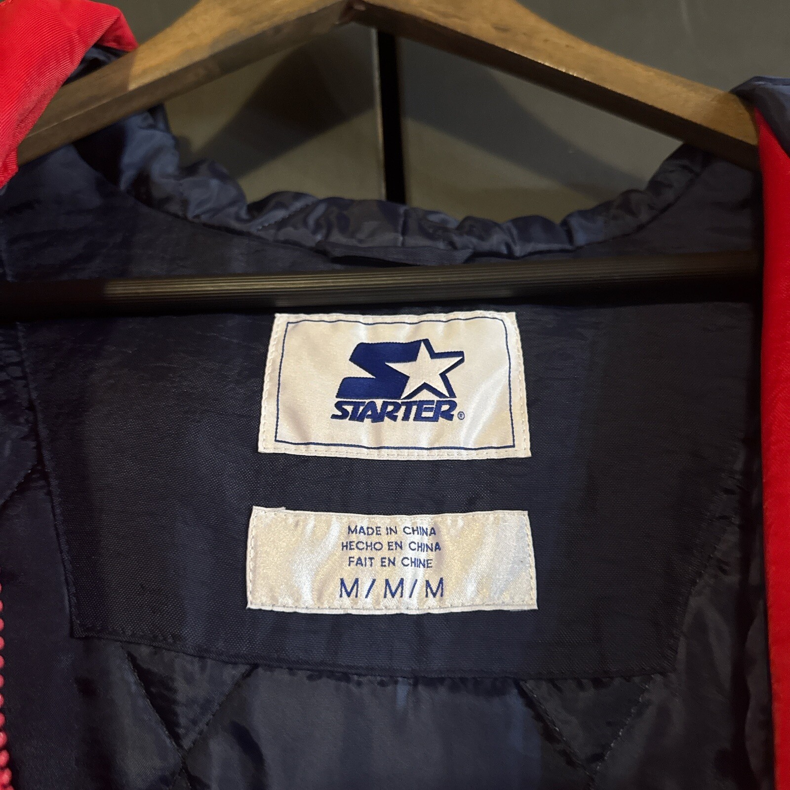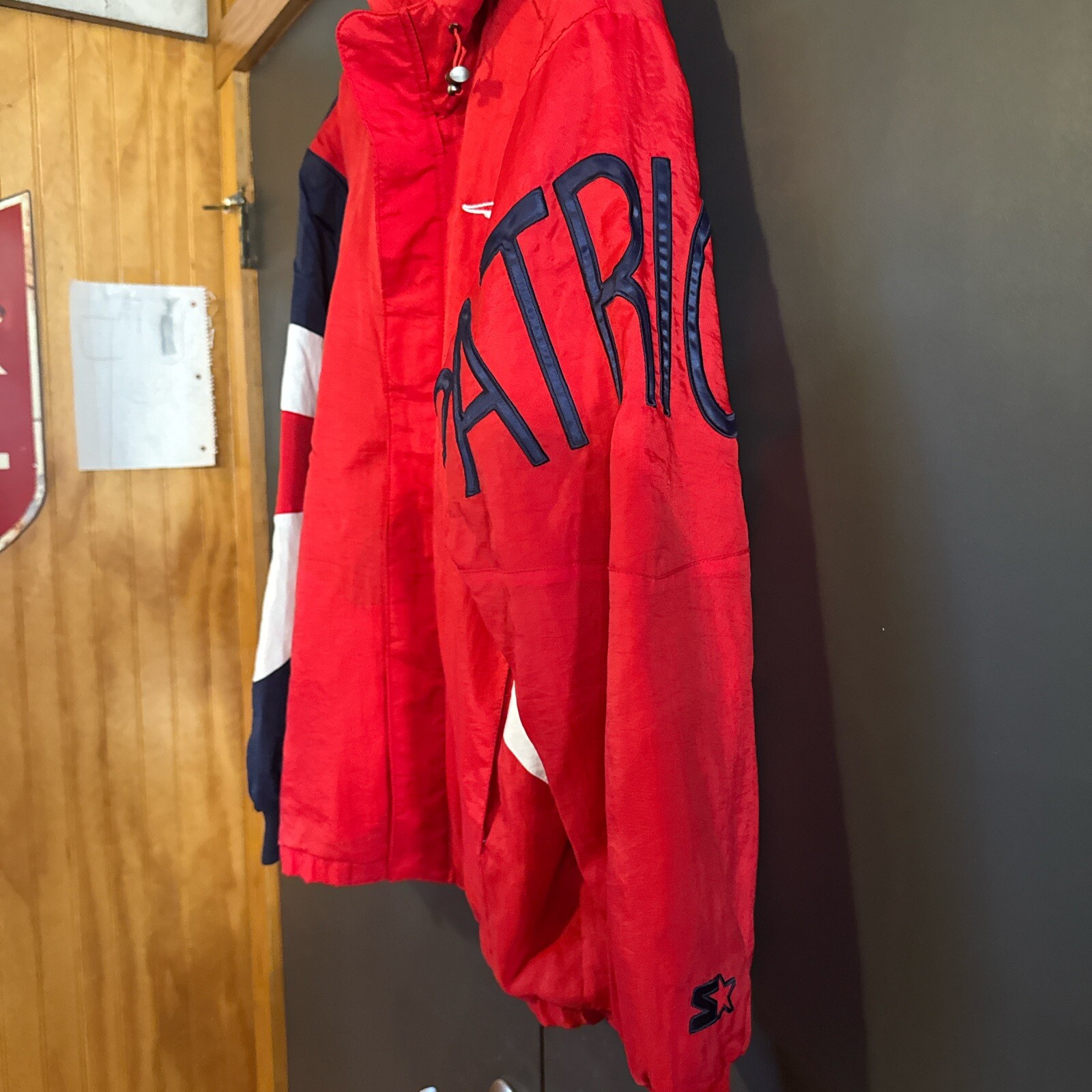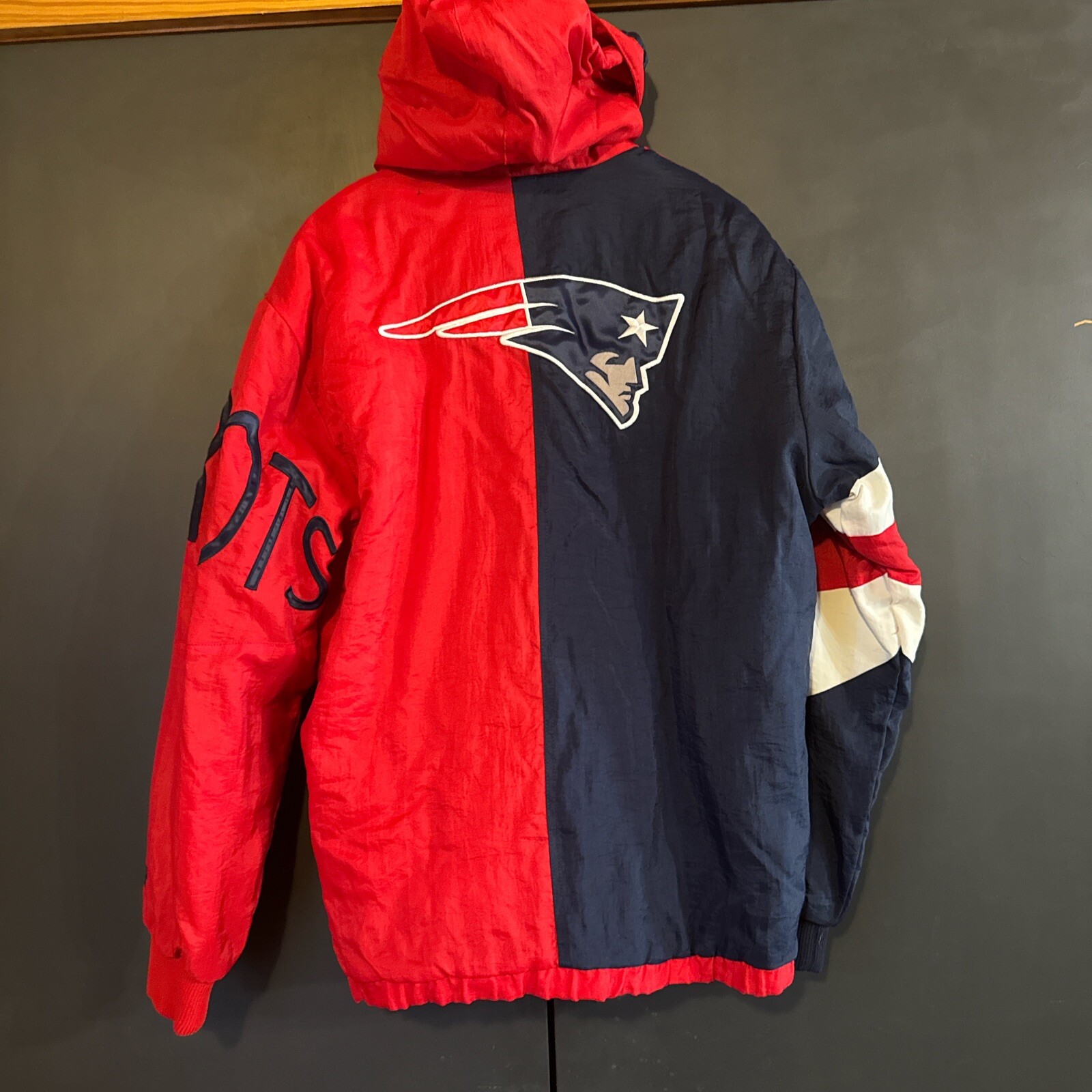 NEW ENGLAND PATRIOTS Starter Spellout Hooded Winter Jacket Medium Nice NFL VTG Great Shape Great Look Patriots Spellout on Sleeve Small spot on back under hood can’t see at all when hoods down. Great Jacket Rare Find #patriots #newengland #nfl