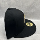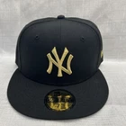 This is a New Era 59Fifty MLB baseball cap featuring the New York Yankees. The cap is in a black color with gold accents, made of polyester canvas material in size 7 1/4. It is suitable for casual occasions and can be worn year-round by both men and women. The cap is not signed or vintage, and it is not personalized or handmade.