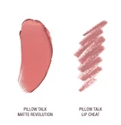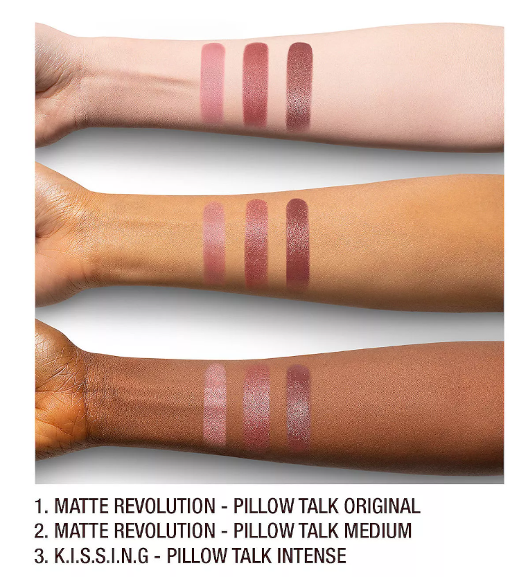 What it is: A mini lip set featuring Charlotte's iconic, bestselling Matte Revolution or K.I.S.S.I.N.G Lipstick with a Lip Cheat Lip Liner Pencil for a dreamy, nude-pink, kissable look. Highlighted Ingredients: - Lipstick Tree and Orchid Extract: Visibly softens, protects, and hydrates lips. Ingredient Callouts: Free of parabens. What Else You Need to Know: Charlotte Tilbury's globally loved Pillow Talk duo is your ultimate secret weapon to re-shape and re-size the look of lips for a "your lips but better" finish. This Set Contains: Pillow Talk Fair: - 0.02 oz/ 0.8 g Lip Cheat Lip Liner in Pillow Talk Fair (cool pink nude) - 0.05 oz/ 1.5 g K.I.S.S.I.N.G Lipstick in Pillow Talk Fair (cool pink nude) Pillow Talk - 0.02 oz/ 0.8 g Lip Cheat Lip Liner in Pillow Talk (nude pink) - 0.05 oz/ 1.5 g Matte Revolution Lipstick in Pillow Talk (nude pink) Pillow Talk Medium: - 0.02 oz/ 0.8 g Lip Cheat Lip Liner in Pillow Talk Medium (warm berry pink) - 0.05 oz/ 1.5 g Matte Revolution Lipstick in Pillow Talk Medium (warm berry pink) Pillow Talk Deep: - 0.02 oz/ 0.8 g Lip Cheat Lip Liner in Pillow Talk Deep (berry rose) - 0.05 oz/ 1.5 g K.I.S.S.I.N.G Lipstick in Pillow Talk Deep (berry rose)