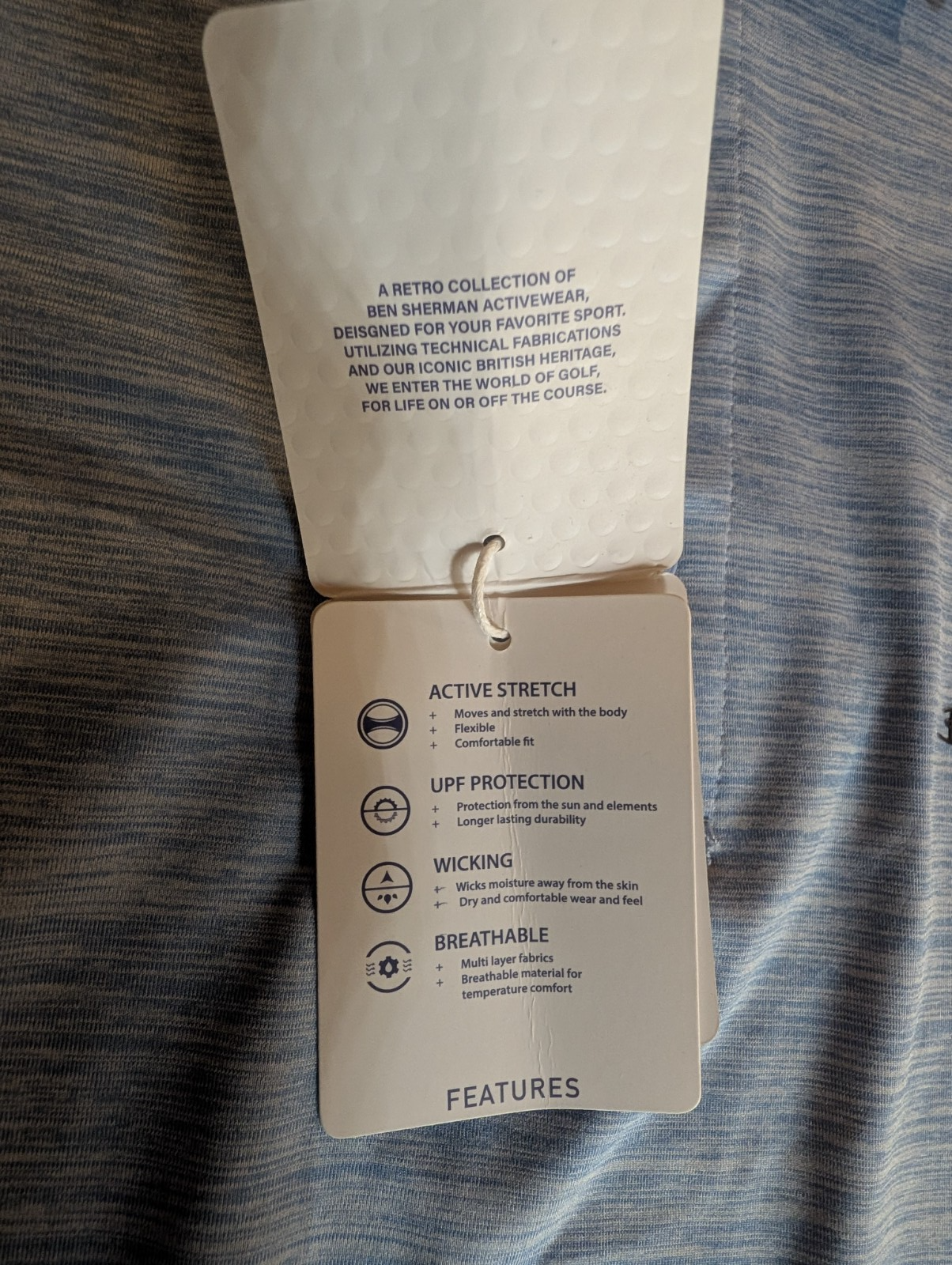 This Ben Sherman sport GOLF AZURE blue heather polo shirt in men's medium size. MSRP $79 This shirt is perfect for activewear occasions, especially for golf. The shirt features a collared neckline with a button closure, short sleeves, and a relaxed fit. Made from a blend of 88% polyester and 12% spandex, the shirt offers comfort and flexibility during movement. The logo accents add a stylish touch to the classic polo design, making it a versatile choice for various seasons throughout the year. Easy to care for with machine washable fabric, this polo shirt is a great addition to any man's wardrobe for active lifestyles.