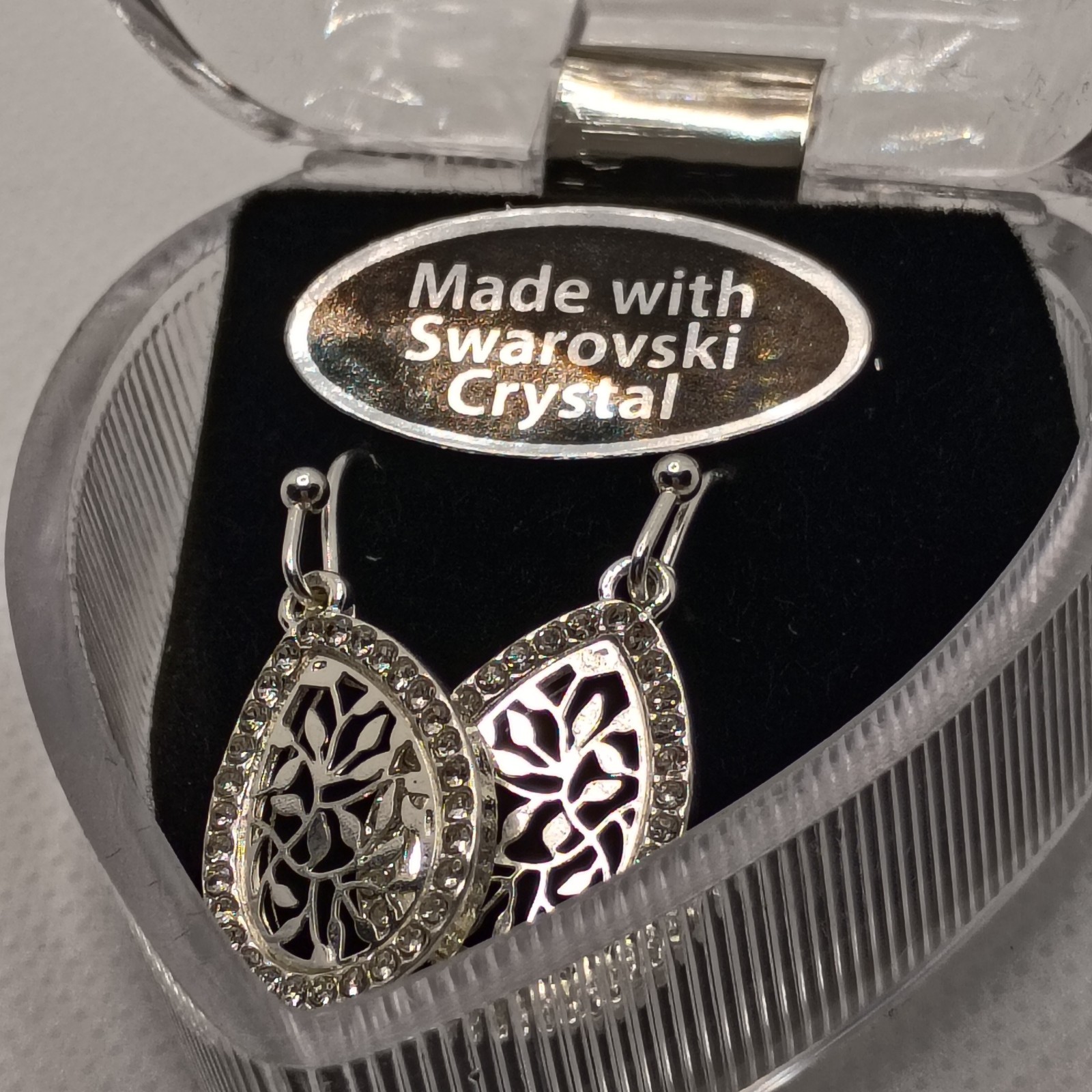 Design: Elegant silver-tone teardrop shape with a delicate filigree center and a sparkling border of crystals. Closure: Secure and comfortable French hook (or shepherd's hook) closures. Presentation: Comes nestled in its original heart-shaped clear plastic gift box with a velvet-like interior, making it the perfect gift for Mother's Day, Valentine's Day, or a birthday