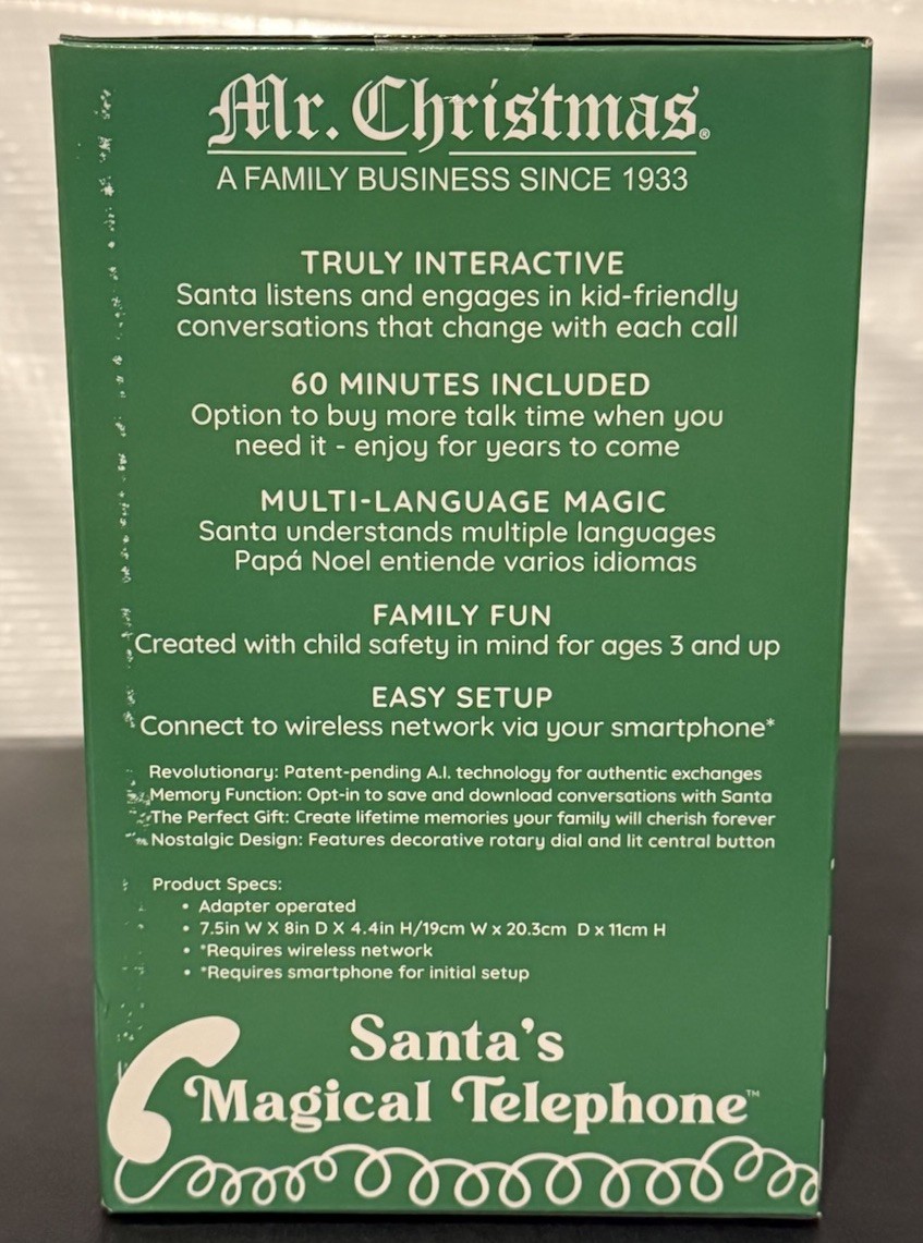Introducing the NEW Mr. Christmas Santa's Interactive Magical Telephone! This festive collectible is perfect for the holiday season and is sure to delight collectors and children alike. With its interactive features, it brings a touch of magic to Christmas celebrations. Santa's telephone is a unique and charming addition to any holiday decor, making it a must-have for those who love seasonal collectibles. Any questions ask!
