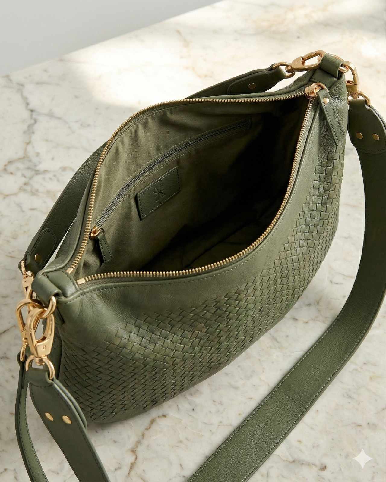 The NEW Quince Italian Leather Convertible Crescent Handwoven Bag in Sage is a luxurious and stylish handbag designed for women. Made from high-quality leather with gold-plated hardware, this shoulder bag features a zip closure and a unique crescent shape. The versatile design allows it to be worn as either a tote or a crossbody, making it perfect for any occasion. The combination of Italian craftsmanship and black leather exterior gives it a sophisticated and timeless appeal, while the black leather handle adds a touch of elegance. This handmade bag from Quince is a must-have accessory for any fashion-forward woman.