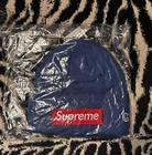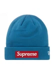 The product is a Supreme New Era Box Logo Beanie in a blue colorway. This beanie is designed for men and women. It comes in one size. It is suitable for winter, fall, and spring seasons. The beanie features a solid pattern with the iconic Supreme box logo in red, making it a stylish accessory for casual outfits. The item is guaranteed to be authentic, adding to its appeal for fans of the Supreme brand.