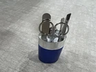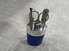 NEW UNUSED Manufacturer's Bank - Travel Vanity Personal Care Kit - Blue Metal Tube Case - Includes Tweezers, Scissors, and Nail Clippers Please see scans for condition. Please ask if you have any questions. Thank you for looking!