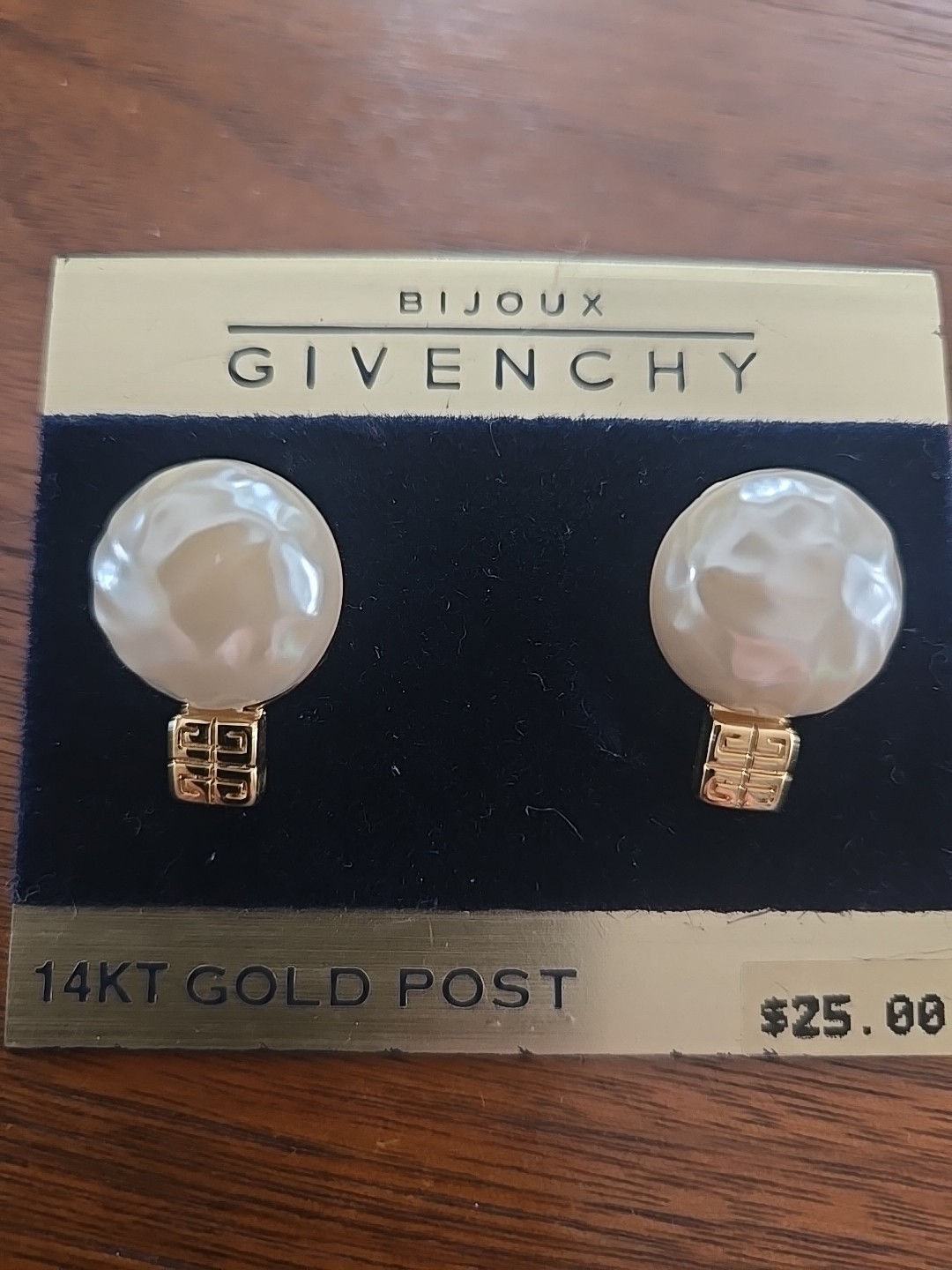 This listing features a deadstock, new and never worn pair of vintage pierced stud earrings. Made by Bijoux Givenchy. They came from the estate of a Givenchy jewelry wholesale rep who worked in the 1980's. This pair is gold toned with a large simulated pearl accent. They measure approximately 1" long and 1/2" across at the widest point. The small drop squares are stamped with the Givenchy logo. Her extensive collection (earrings, necklaces and bracelets) will be listed for sale in the upcoming weeks.