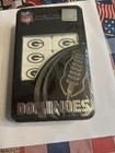 The NFL Green Bay Packers Collector Edition Double Six Dominoes by MasterPieces is a unique sports memorabilia item featuring the team's iconic green and yellow colors. This officially licensed product is designed for football fans and collectors alike, showcasing the team's branding and league affiliation with the National Football League (NFL). Made in the United States, this collector's edition set is sealed and ready for display or gameplay, making it a perfect addition to any Green Bay Packers fan's collection.