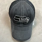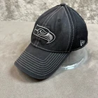 NFL Seattle Seahawks Black Mesh Trucker Hat Baseball Cap New Era Small medium S M 39Thirty Thick mesh back, with some stretch. Size Small/medium. Gently worn, no flaws or major wear, some minor fading to front, see photos.