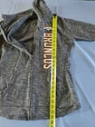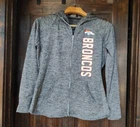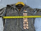 Show your team spirit with this Denver Broncos Women's Full Zip Up Hoodie Sweatshirt from NFL Team Apparel. The gray, striped pattern is perfect for any occasion, whether you're out for a run or just running errands. The long sleeve hoodie features a zip closure and pockets for added convenience. Made from a blend of polyester and spandex, this hoodie is machine washable for easy care. Get yours today and show your support for the Denver Broncos! Good overall condition showing just typical wear from use and washings.