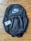 This is a Nike Heritage backpack in black, designed for unisex adults. It has a capacity of 25 liters and features 3 compartments, including a laptop sleeve, adjustable and padded shoulder straps, and a shoulder strap handle style. The dimensions are 17" in length, 12" in width, and 6" in depth. Made of polyester, this backpack is suitable for school use and is brand new.
