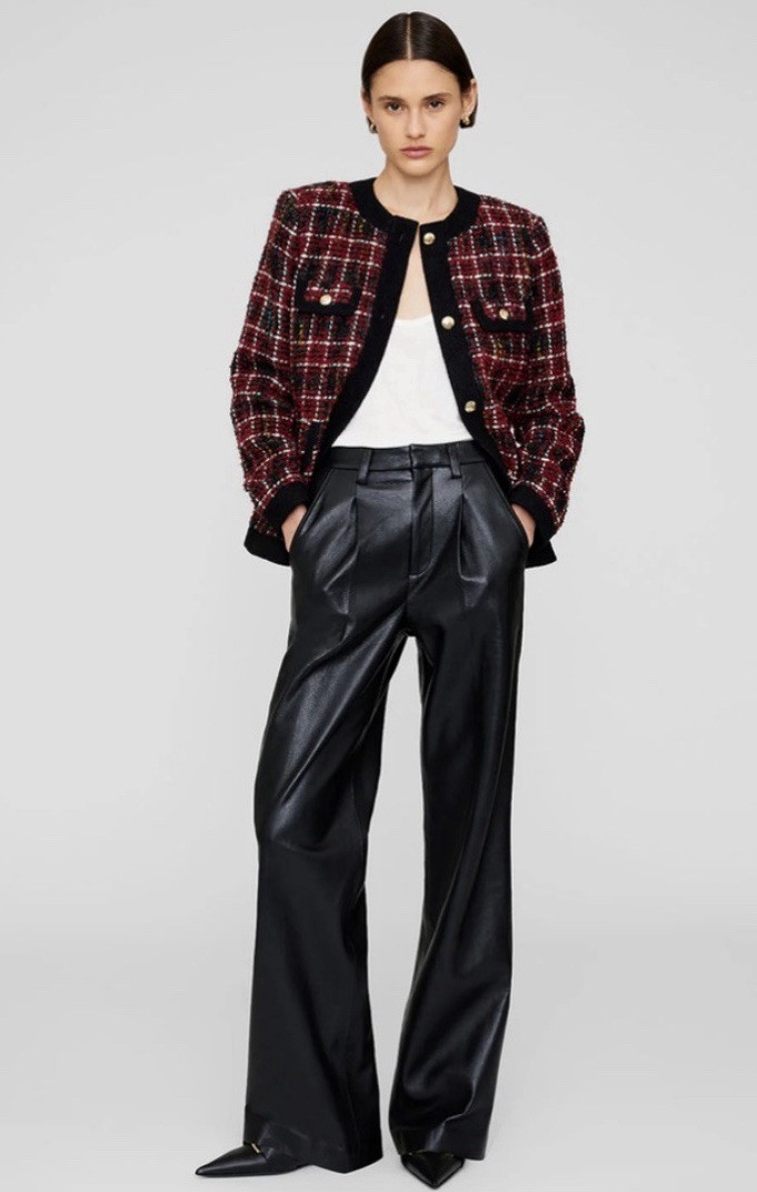 This is a pair of NWT Anine Bing Carmen Recycled Leather Pants in Black, with a size 0 / 30. These wide-leg pants are crafted from leather, adding a touch of edgy style to any outfit. The brand, ANINE BING, is known for its high-quality and fashionable pieces, making these pants a chic addition to a woman's wardrobe.