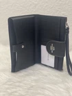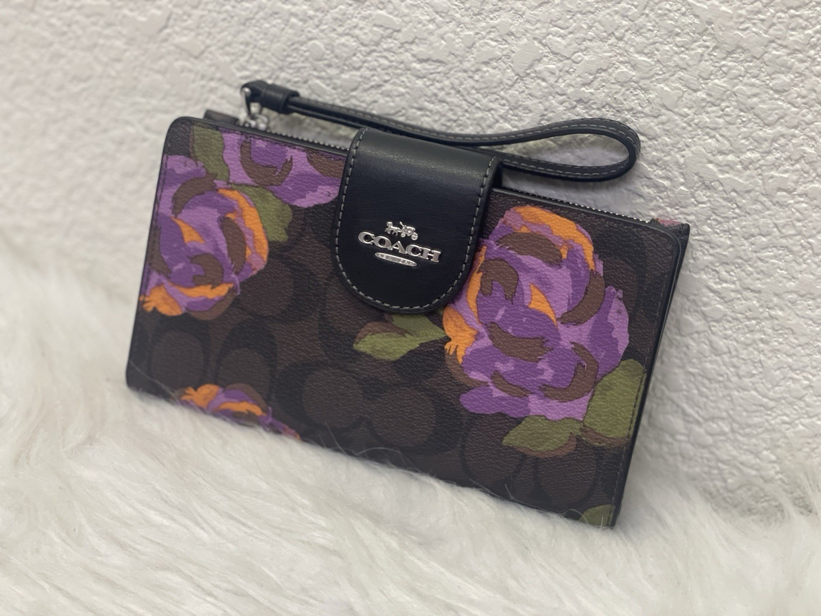 NWT Coach CL674 Large Phone Tech Wallet Wrist Strap Rose print Product Details Signature coated canvas and smooth leather Six credit card slots ID window Snap phone compartment Snap closure Outside zip pocket Attached wrist strap 7 1/4" (L) x 4 1/2" (H) Fits all iPhone and Samsung Galaxy phones Style No. CL674 Price is firm o