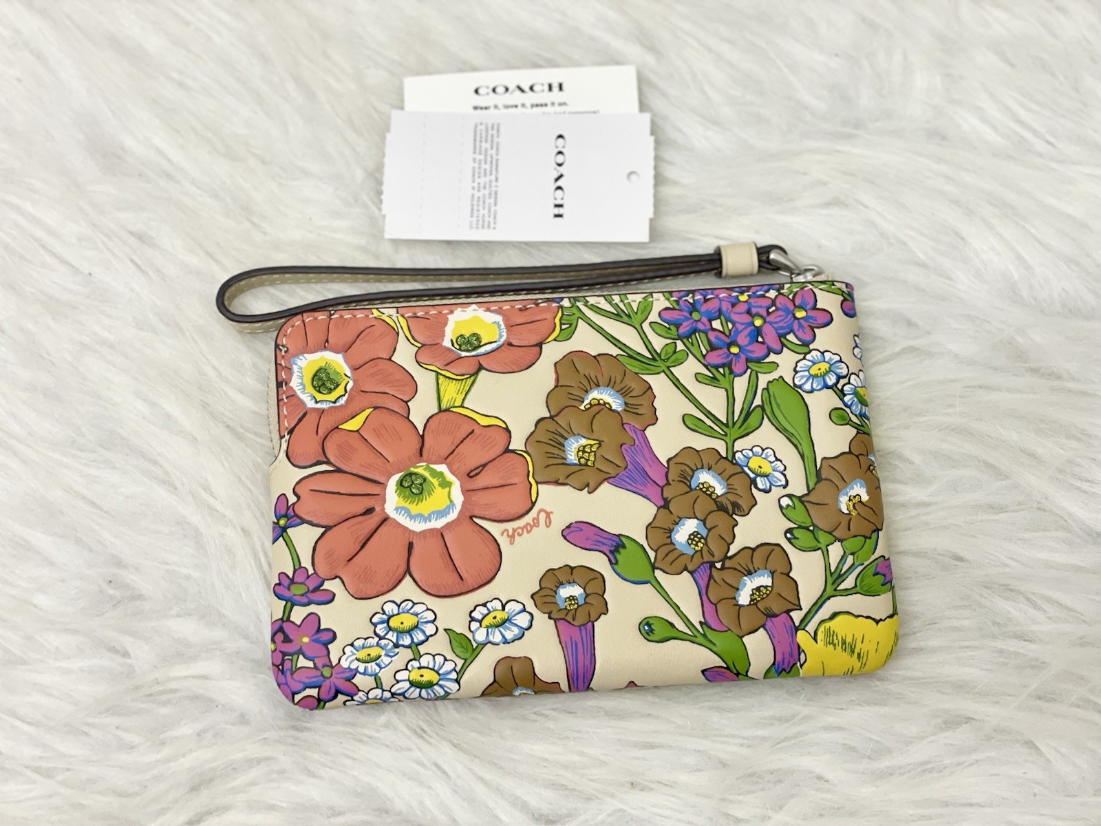 COACH Corner Zip Wristlet With Floral Print Brand new with tags 100% Authentic Limited Edition COLORS: SILVER/IVORY MULTI Wallet detail: Smooth leather Two credit card slots Zip-top closure, fabric lining Wrist strap attached Size: 6 1/4" (L) x 4" (H) x 1/2" (W) Style No. CR946 Fast shipping Price is firm