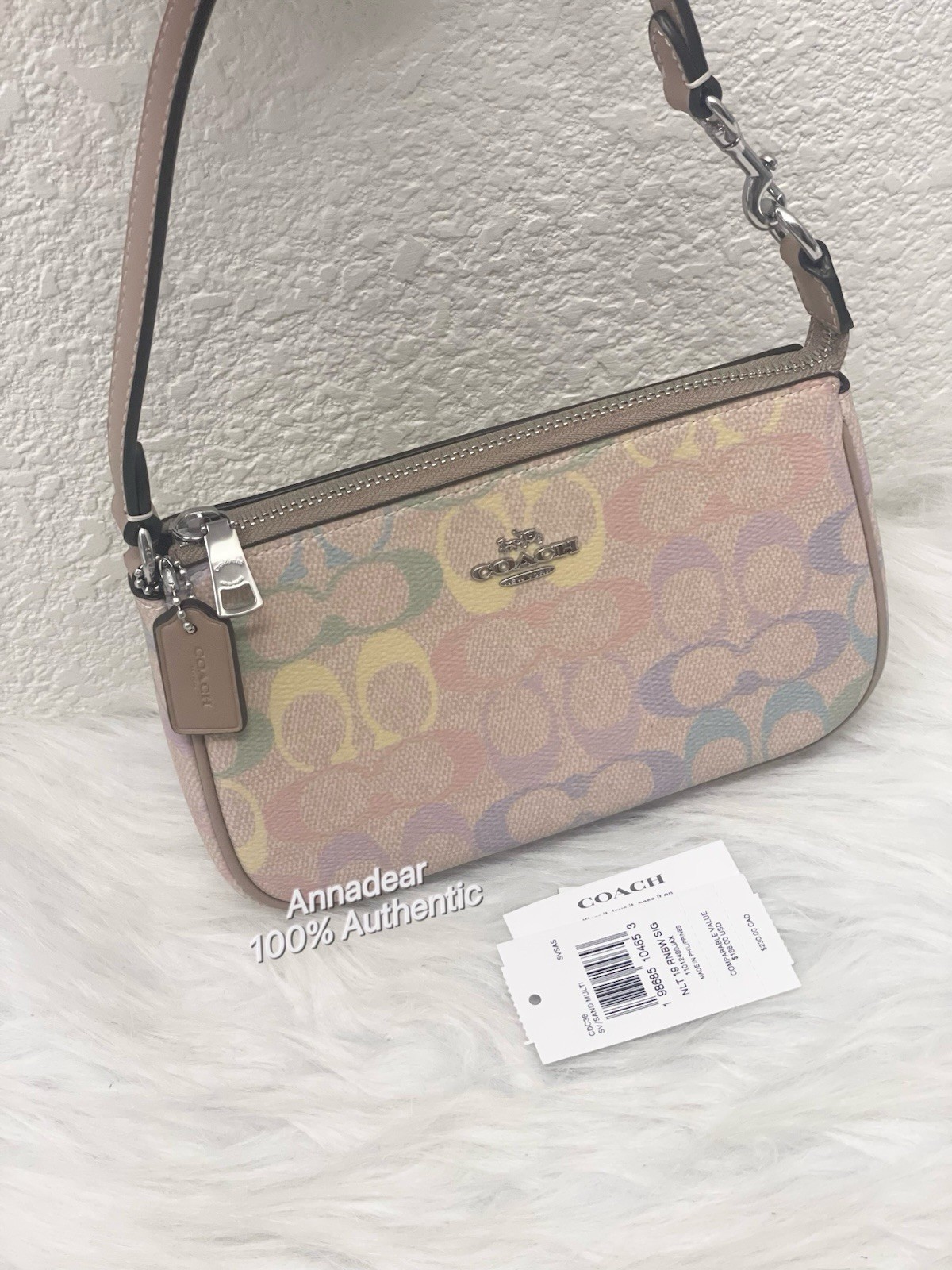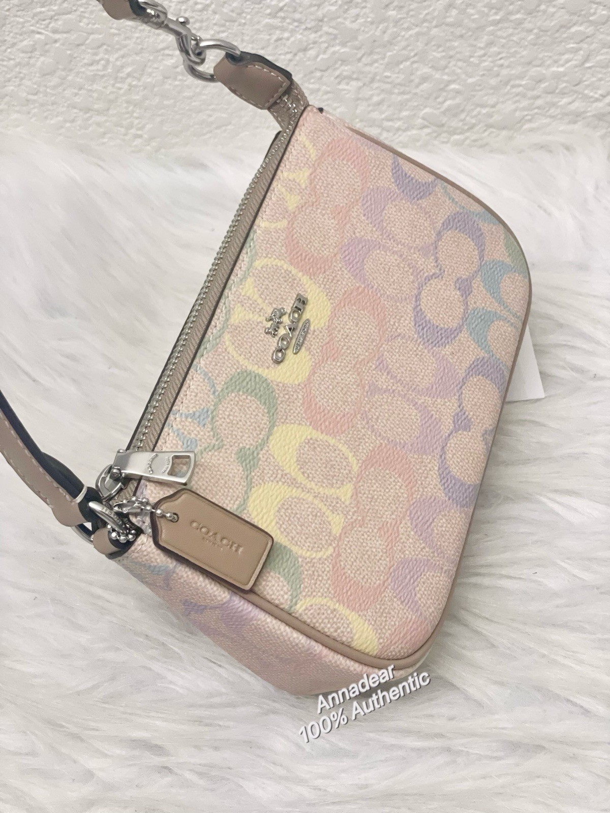 Brand new with tag NWT Coach Nolita 19 In Rainbow Signature Canvas cdc38 Silver Sand 100% authentic, buy directly from Coach Style Number: CDC38 Measurements Length: 7.5" Height: 4.5" Width: 2.0" Materials Signature coated canvas Fabric lining Features Two credit card slots Zip-top closure Fast shipping & price is firm