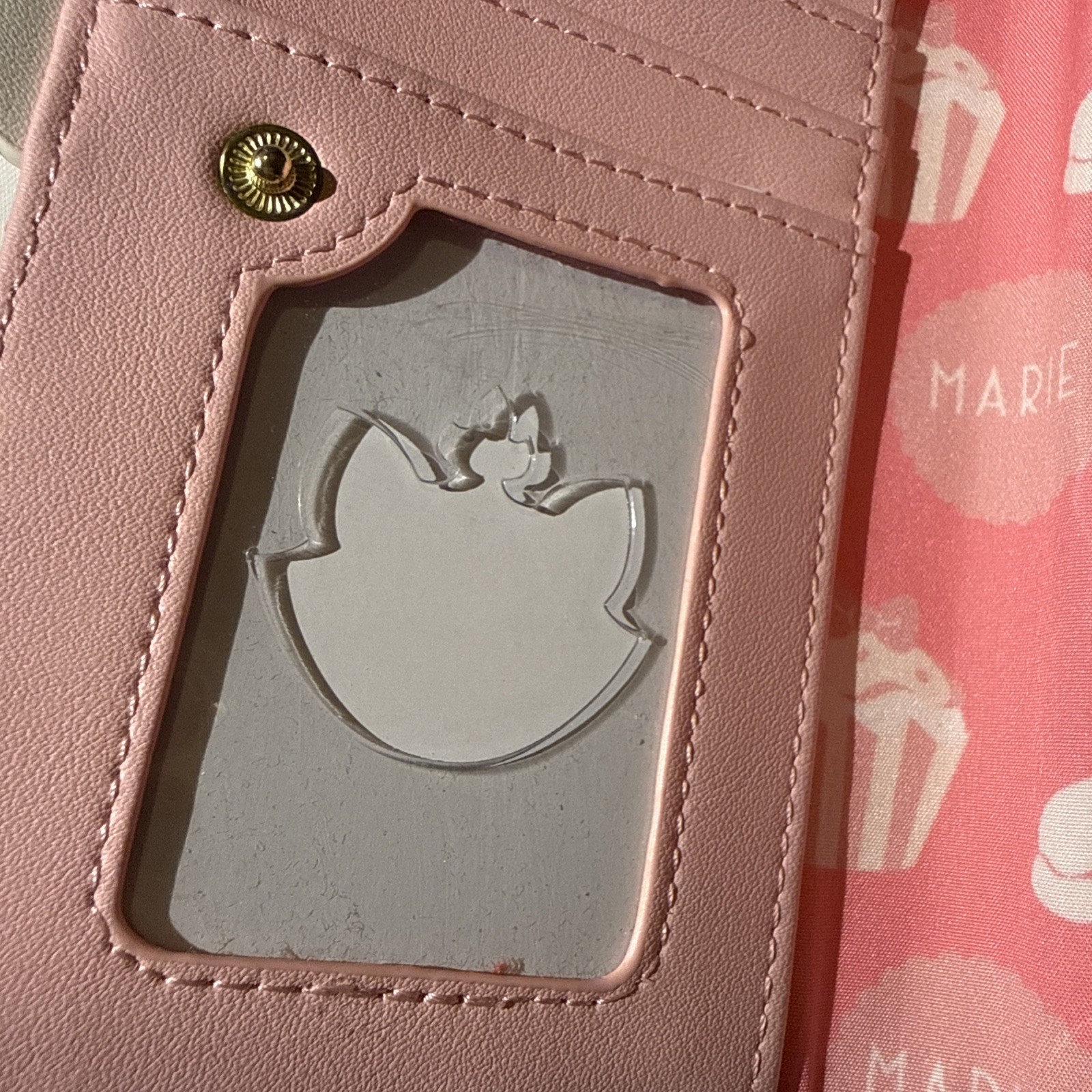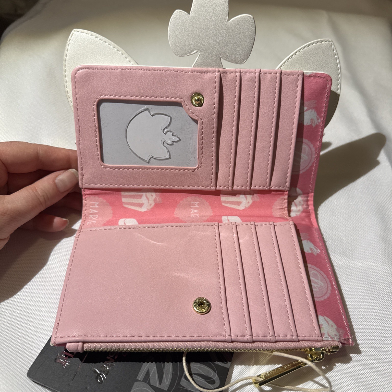 The cutest Disney cat around featured as an adorable cupcake in this whimsical Disney Loungefly Wallet. The front has her signature white fur tuft and pink bow that lead down to pink sprinkles in delicate pink hues. The back is pink stripes with light and dark contrasting shades and the Disney Loungefly hard tag. Open it up to 8 card pocket, (ID slot with the Marie silhouette!) 3 receipt or cash pockets and a golden zippered coin pocket. Perfect Valentine’s Day gift for your significant other, child, or even just your best friend who loves this fluffy white cat.