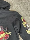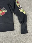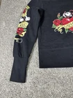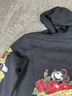 This NWT Disney Parks Women's Hoodie features a full zip design with Mickey Mouse wearing hearts and roses. The cropped style makes it perfect for activewear during all seasons. Made from a blended fabric with a cotton lining, this hoodie is easy to care for and features rhinestone accents on the zipper. With a crew neck and long sleeves, this hoodie is a must-have for any Disney fan looking for a stylish and comfortable addition to their wardrobe. 2336 Please note there is a slight snag on the front left side under the rose. Does not show in picture