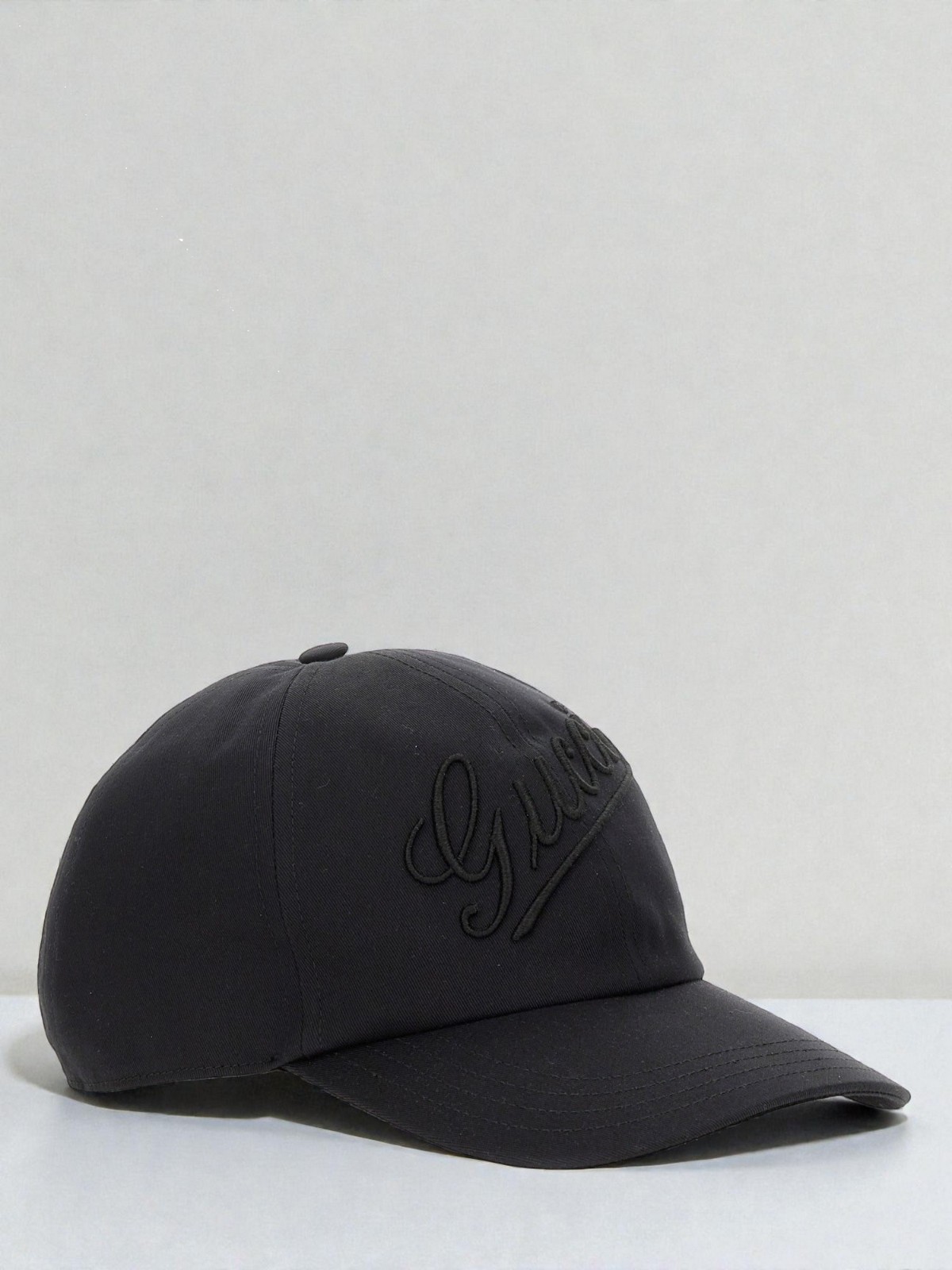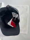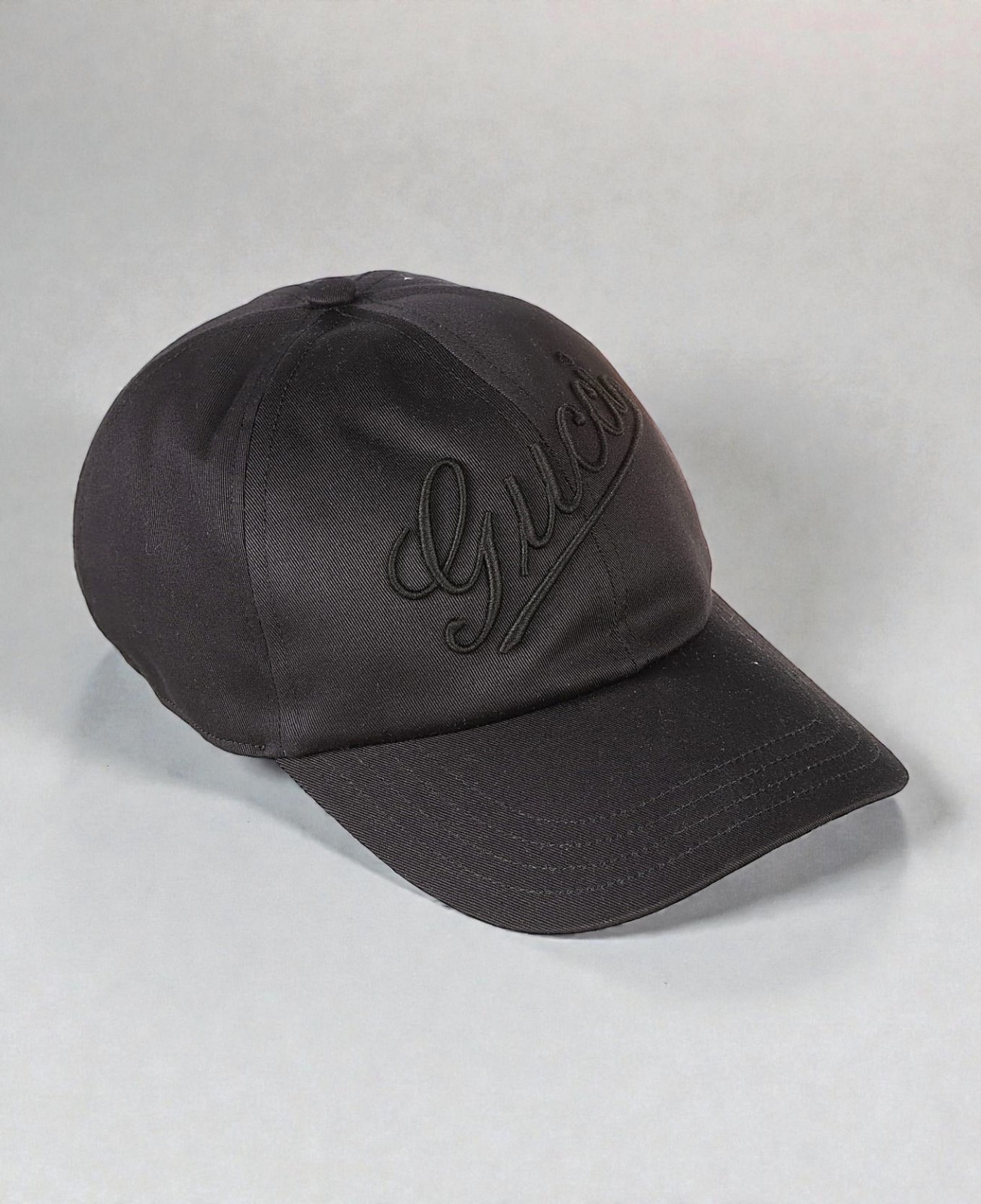 New with tags Gucci logo-embroidered cotton baseball cap Comes in its designer dustbag Made in Italy Highlights black cotton six-panel construction embroidered logo to the front fabric-covered button at the crown curved peak curved narrow brim adjustable strap to the rear Lining: Cotton 100% Outer: Cotton 100%, Polyester 100%