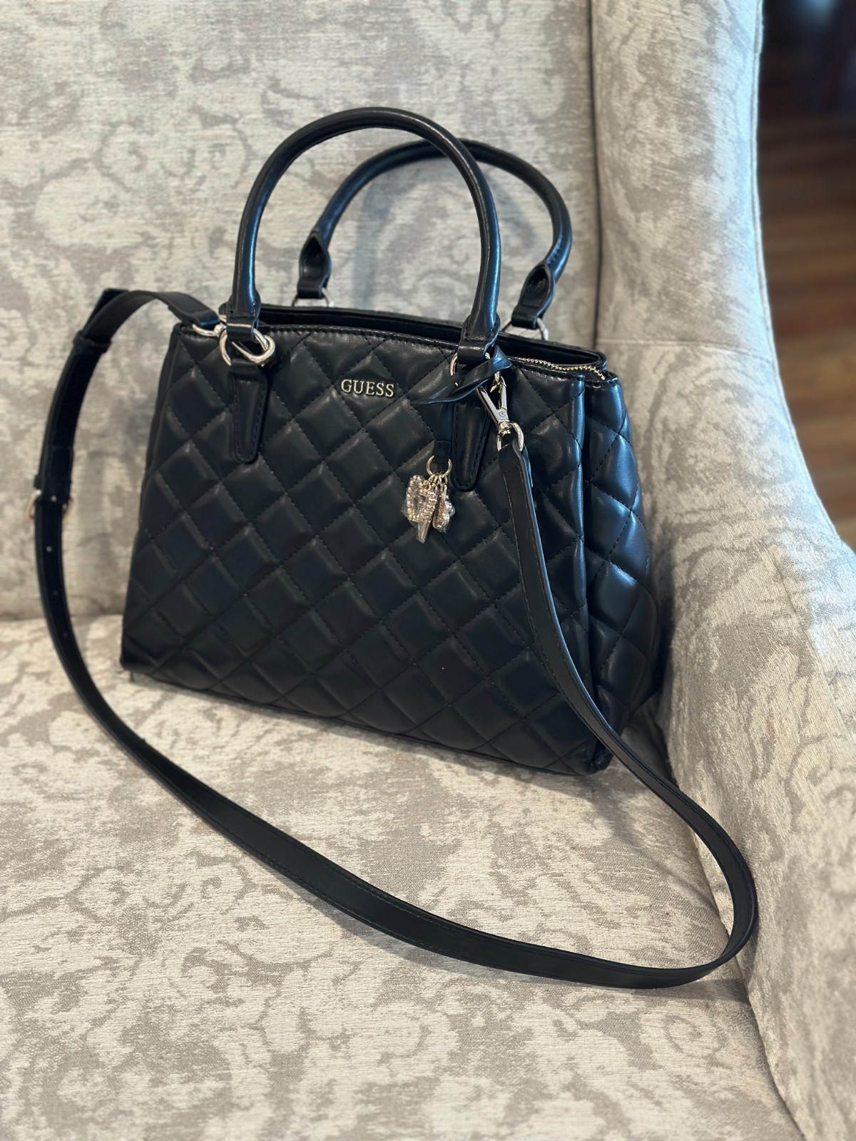 Stylish whether you wear it as a crossbody or carry it by the handles, this versatile Tinsley satchel by GUESS showcases a quilted exterior and triple compartment interior. Features Medium-sized bag; 12"W x 9"H x 5"D (width is measured across the bottom of handbag); 1.5 lb. approx. weight Silhouette is based on 5'9" model 4"L handles; 23"L adjustable, removable crossbody strap Zip closure Gold-tone exterior hardware & removable charm; 2 interior zip pockets & 4 slip pockets Lined Tablet compatible (std. size 8"-10") 100% polyurethane Spot clean Imported