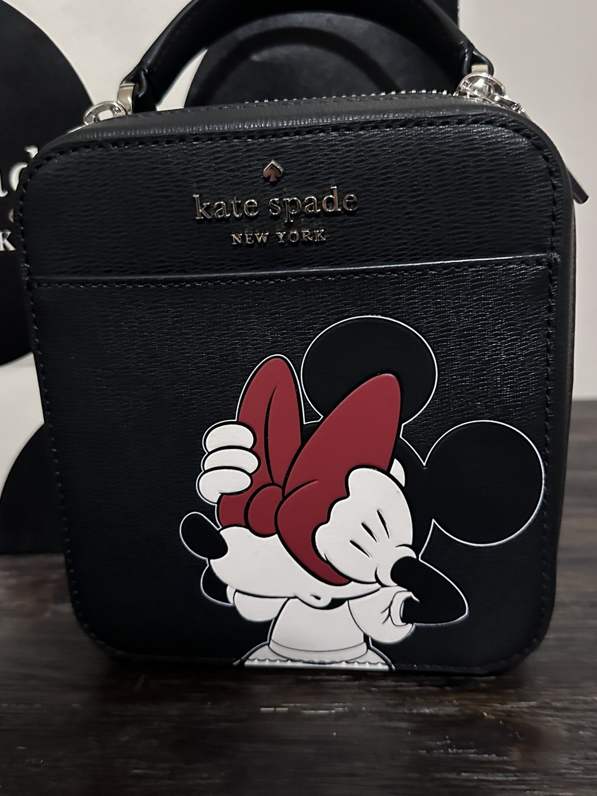 The NWT Kate Spade Disney X Black Minnie Mouse Vanity Crossbody Bag is a stylish and compact purse perfect for any Disney fan. Made of black leather with gold hardware, this small bag features a top handle in black leather and a fabric lining. The exterior showcases a playful Mickey and Minnie Mouse design, making it a fun yet sophisticated accessory for any outfit. With a zip closure and adjustable shoulder strap, this bag is both practical and fashionable, ideal for any woman on the go.