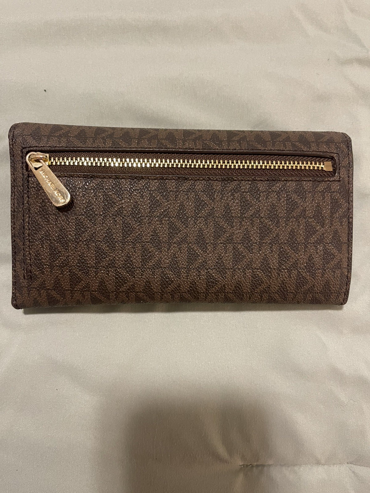 The Michael Kors Jet Set Travel Large Trifold MK Signature Wallet in Brown . Made from leather, this wallet features a classic logo pattern and zipper accents for added flair.. Signature Coated Canvas, Gold Tone Hardware,17 Credit Card Slots, 4 Bill Compartements, 1 Zip Compartment at Back. Size 18.2cm x 9.8cm x 1.5cm.Small tear on side see pics. Overall pretty good condition except for small leather tear. See pictures for details
