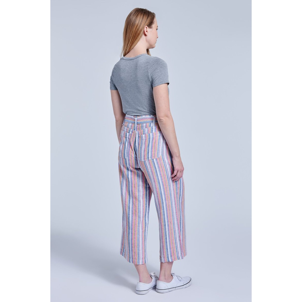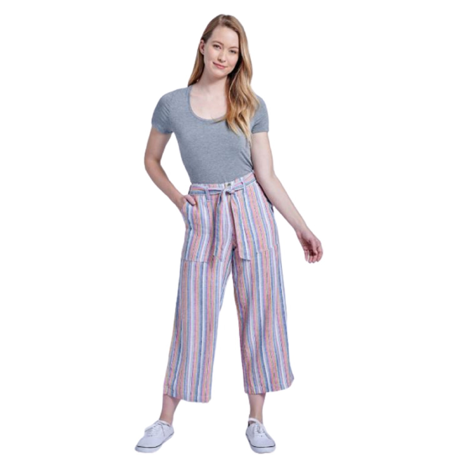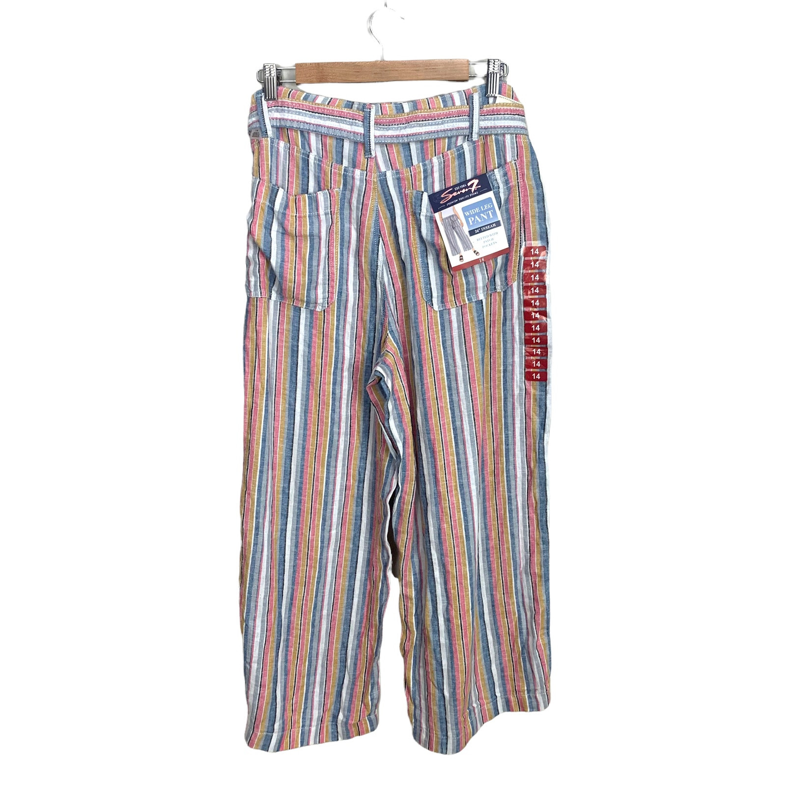 NWT Seven7 Multicolor Rainbow Stripe Wide Leg Linen Pants Patch Pockets Paperbag Paper Bag Waist Belted 14 L Large Brand new, never worn, no flaws. Size 14. Super cute, comfy, practical with a really fun colorful flair! Approximate measurements: Waist: ~19" Rise: ~11" Inseam: ~26" Length: ~37"