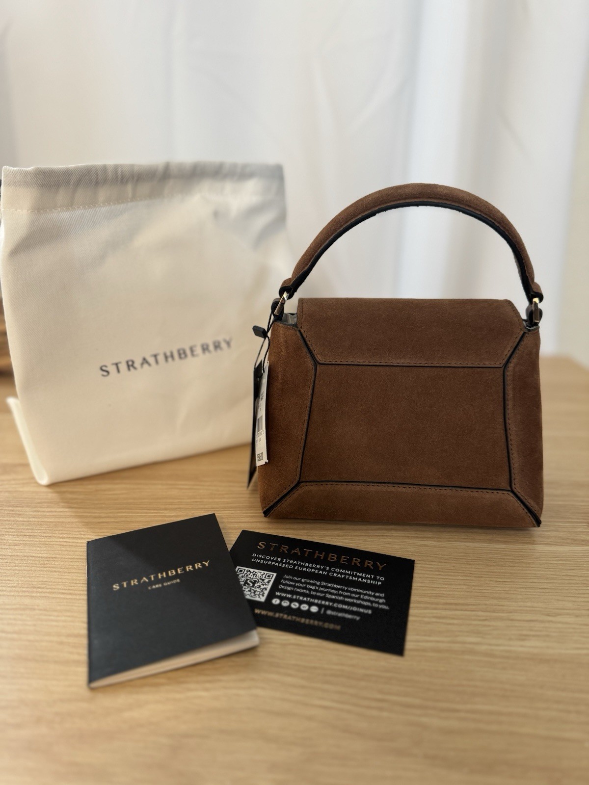 NWT Strathberry Mosaic Nano Brown Suede Top Handle Bag | Gold Bar. Condition is New with tags. Shipped with USPS Priority Mail.