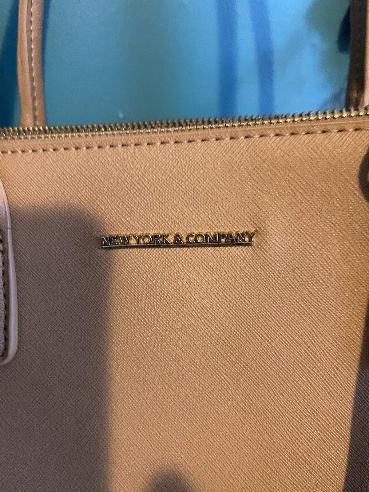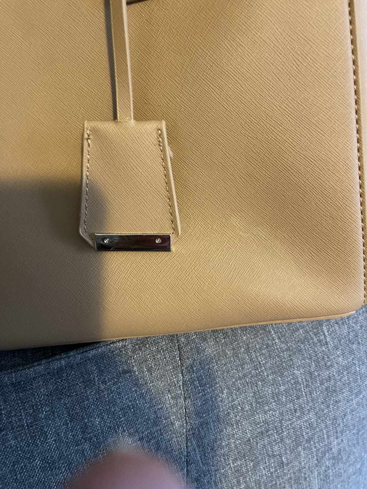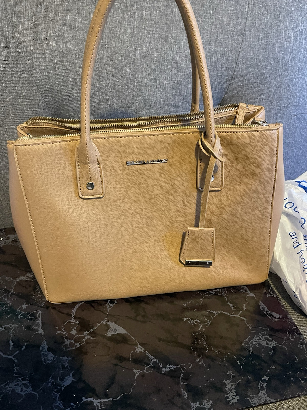This New York And Company tote bag is the perfect addition to your collection. With a spacious interior and exterior, it is ideal for travel, formal events, workwear, and business purposes. The bag features a solid pattern in a stylish camel color, with a rectangle shape and a snap and zip closure for added security. The double handles and faux leather exterior material make it easy to carry around, while the beige lining and handle/strap material provide a sophisticated touch. Measuring 13 inches in width, 10 inches in height, and 5 inches in depth, this large tote bag is perfect for anyone who wants to stay organized and stylish on-the-go.