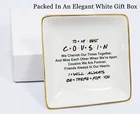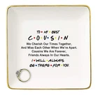 NZY Jewelry Holder Gift for Cousin-To My Best Cousin,I Will Always Be There for You-Trinket Tray Gift– Birthday Christmas Graduation Wedding Gifts for Cousin,Women,Her - Friends TV Show -Ring Dish Product Details Pattern Name: 4-To My Best Cousin I Will Brand: NZY UPC: 768432432362 EAN: 0768432432362 MPN: Does not apply Color: White Brand: NZY Material: Ceramic Style: Modern Special Feature: Washable Recommended Uses For Product: Ring Product Dimensions: 0.8"D x 4"W x 0.8"H Target Audience: Women Shape: Elephant, Square Occasion: Mother's Day, Wedding, Birthday, Valentine's Day Color: White Brand: NZY Material: Ceramic Style: Modern Special Feature: Washable Recommended Uses For Product: Ring Product Dimensions: 0.8"D x 4"W x 0.8"H Target Audience: Women Shape: Elephant, Square Occasion: Mother's Day, Wedding, Birthday, Valentine's Day Mounting Type: Table Top Finish Type: Glazed Inner Material: Ceramic Closure Type: no closure Number of Drawers: 1 Item Weight: 0.2 Pounds Number of Compartments: 1 Jewelry Storage Type: Jewelry Tray Number of Items: 1 UPC: 768432432362 Manufacturer: NZY Item Weight: 3.2 ounces Finish: Glazed Pattern: 4-To My Best Cousin I Will Number Of Pieces: 1 Special Features: Washable Date First Available: October 28, 2021 SIZE: 4"L x4"W x 0.8"H ; Note: Small trinkets are not included EXQUISITE and SAFETY PACKAGE:The jewelry tray is wrapped up and down with 2 sponges to avoid shaking due to transportation and also packed by a exquisite White gift box MATERIALS: Pattern on the jewelry tray is fired at a high temperature and will not fade in long term use, even if you wash it often; Crafted from quality glazed white golden edge square ceramic, stylish and elegant GREAT PRESENT IDEAS: This elegant jewelry tray is specifically designed for girls or women to organize their rings, earrings, bracelet, necklace,etc; You can put the ring dish in the bedroom, nightstand, bathroom or kitchen or in the office, take off accessories anytime and anywhere without worrying about them getting lost MULTI-SCENARIO USE: Our jewelry trays are suitable for various festive presents,as retirement party, mother's Day, sleepover party, Thanksgiving Day, Christmas,Birthday ,white elephant exchange, Stocking Stuffers, and so on; Just imagine how surprised they will be when receiving this memorable trinket jewelry tray This Exquisite ring dish is specifically designed for female lady who wants to keep their rings, earrings, bracelet, necklace, cosmetics when they take it off. It's the best gift for colleagues, family, friends,women or girls.