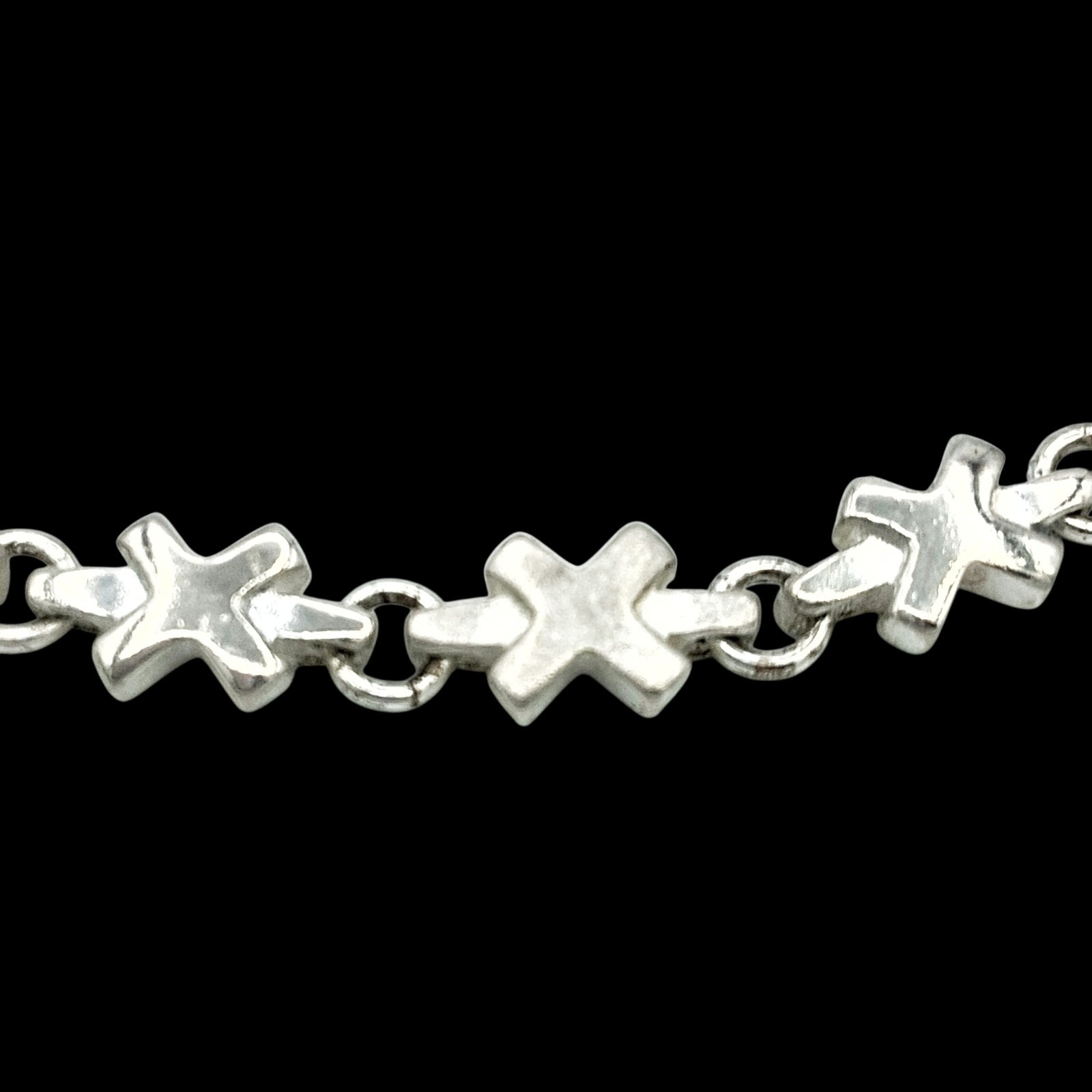 Sculptural Napier silver tone necklace featuring alternating brushed and polished X-shaped links. The contrast finishes give the piece depth and visual movement, while the solid, weighty construction provides a substantial feel when worn. The X motif reads as modernist and graphic, making this an easy statement piece that still layers well. Signed Napier on the hangtag. While the design has a classic Napier aesthetic often associated with vintage production, the hangtag style suggests this may be a later piece inspired by their earlier modernist designs. Finished with a lobster clasp and extender for adjustable length. A versatile necklace that works equally well with minimalist looks or bold, architectural styling. Approx Measurements: Necklace length: 16" + 2" extender Condition: Very good condition. Light surface wear consistent with normal use. No damage or missing links. Materials & Closure: Silver tone metal with brushed and polished finishes Lobster clasp with extender Shipping: Ships from a smoke-free, pet-friendly home.