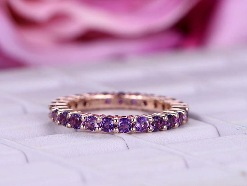 Natural Amethyst Eternity Wedding Band Rose Gold Plated Silver Anniversary Ring