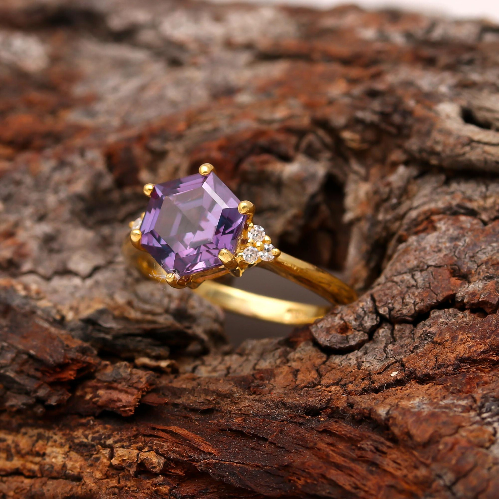 This is a handcrafted 925 sterling silver ring with a natural Amethyst gemstone and gold plating. The ring is available in sizes 4 to 12 US and can be personalized according to the customer's preference. It is designed by the brand Pink Galaxy and showcases a celebrity-inspired style. Made in India, this elegant ring is suitable for both men and women and is a perfect accessory for everyday wear or special occasions.