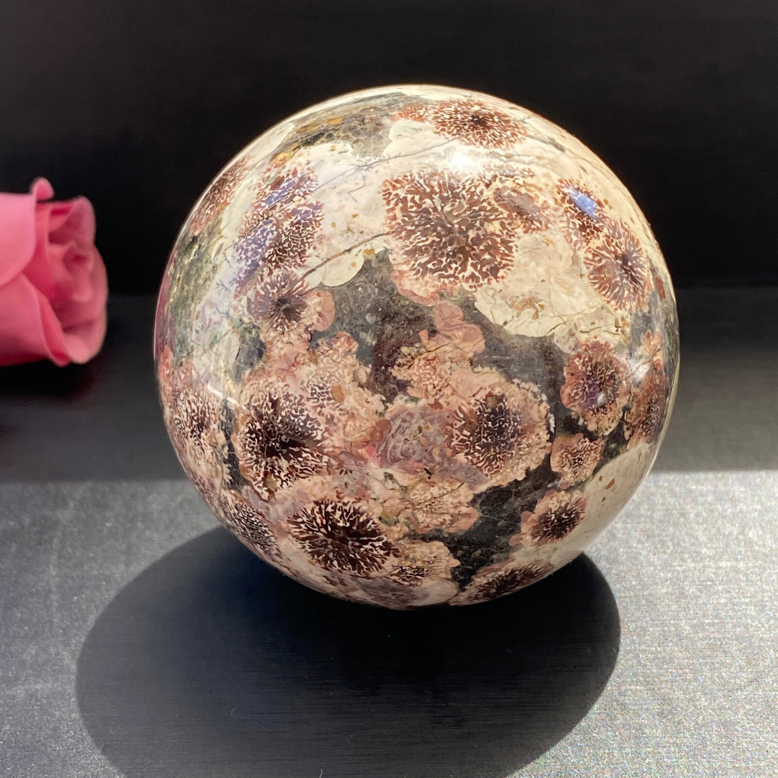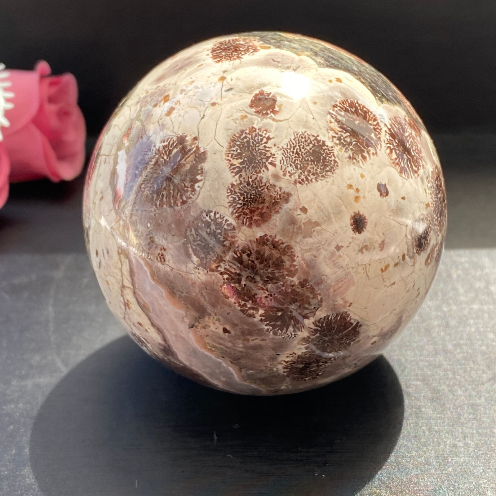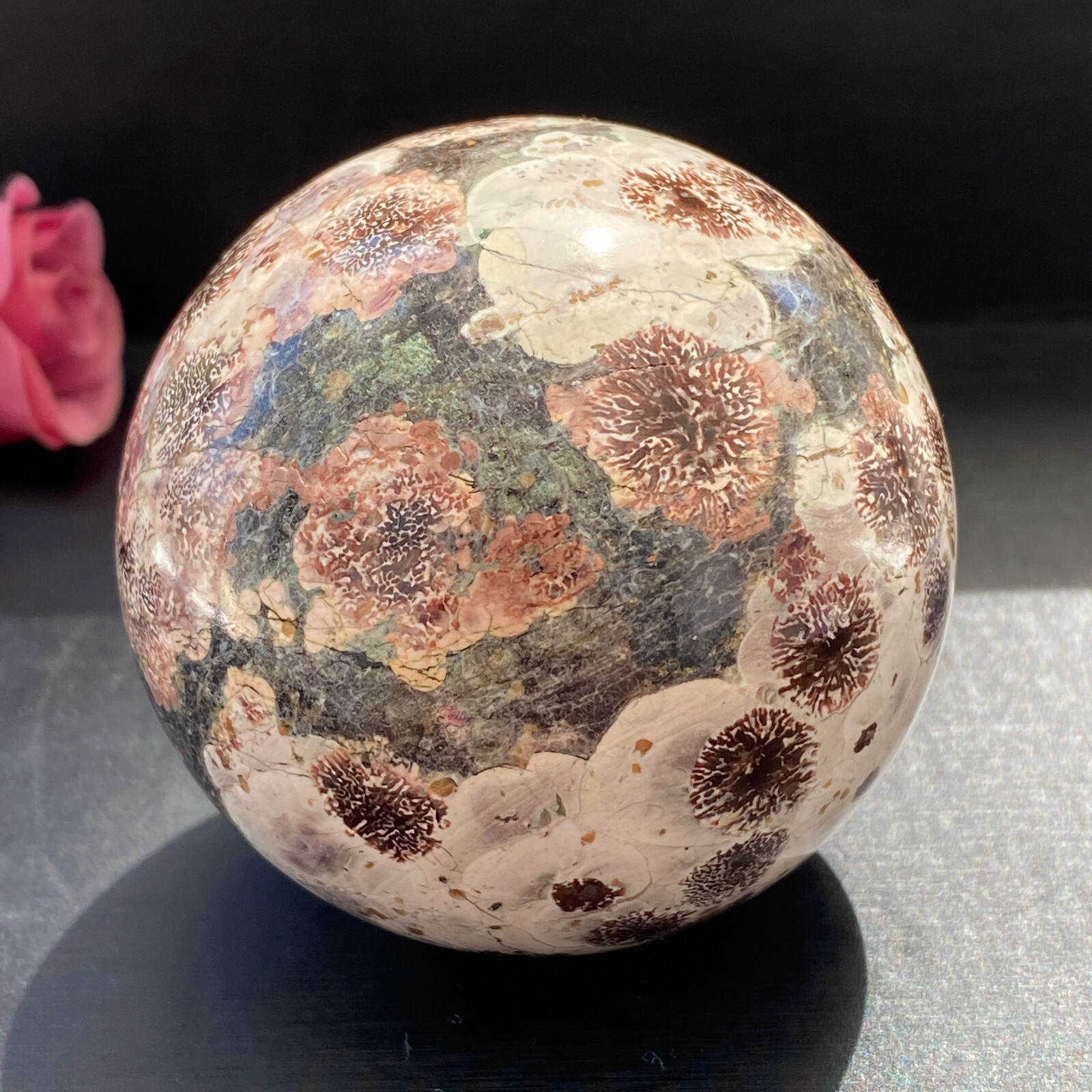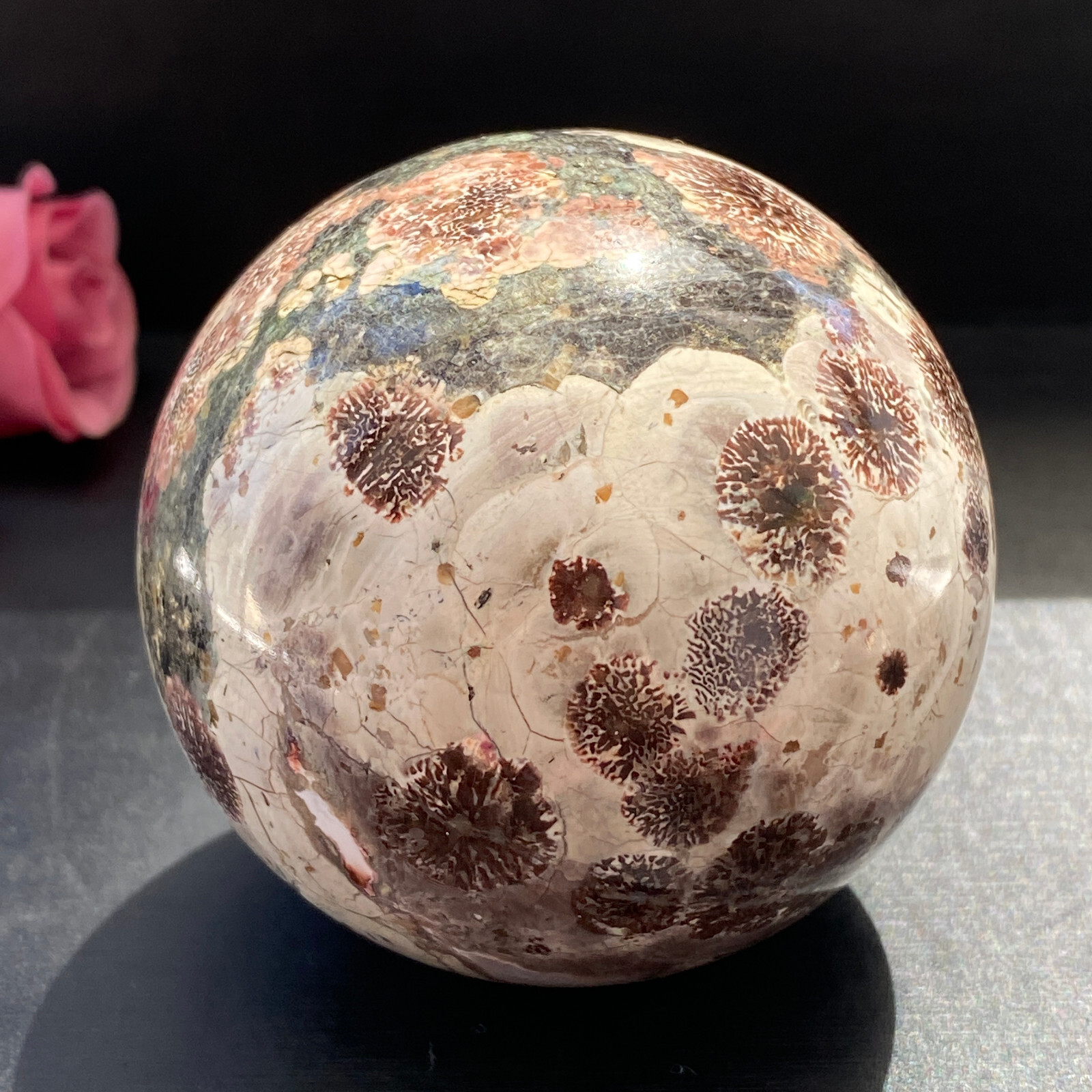 Received exact sphere pictured and described in the listing. An excellent, cleanly shaped stone with a good finish polish. Colors are bold and bright. Even better in hand, than it appeared in its listing photos. Communication with the shop was good. Shipping time from mainland China very acceptable, in light of the distance traveled. Sphere was delivered in good order and perfect condition. Well pleased with my blue/green Turquoise sphere. Good job by this eBay seller.