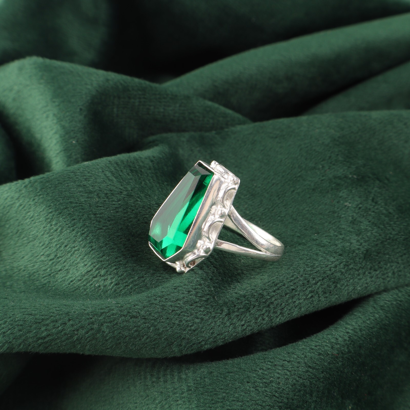 Welcome To Our Shop Gempires ------------------------------------------- Complete your look for a glamorous evening in this gorgeous Sterling Silver Ring studded with Green Emerald. This will go well with all of your dresses and are attention seeking. Faceted Natural Green Emerald Band Ring Jewelry 925 Sterling Silver US All Size Check My Other Ring Listings : Click Here SKU:- RR-45-3 Metal:- Sterling Silver Metal Purity:- 925 Gemstone:- Green Emerald Gemstone Color:- Green Gemstone Shape :- Coffin Gemstone Creation :- Natural Stone Setting :- Bezel Ring Size:- All Size US ___________________________________________________________________ Shipping Handling - Free Standard Shipping all over the world Handling Time - 2 to 5 BUSINESS Days Delivery Time - 7 to 20 Days ( Various on destination ) _________________________________________________________________ Returns - 1.We provide a 100% Money Back Guarantee, excluding shipping costs, within 30 days from the date of item receipt. 2.The item must not be altered or damaged in any way shape or form. 3.Upon receipt of the aforementioned items, your payment will be promptly refunded. 4.Please be so kind as to contact us via email in order to acquire comprehensive return instructions before proceeding with the return of the merchandise. 5.Kindly be advised to allocate a maximum period of 1 business day for the processing of all returns, in order for the appropriate credit to be applied. 6.Sizing does not affect the return policy. _________________________________________________________________ FAQ's - Q.1 ARE THE ITEMS YOU ARE SELLING BRAND NEW? We exclusively offer brand-new products, refraining from the sale of pre-owned jewelry. Our entire jewelry collection is composed of 100% natural, conflict-free pieces. We do not engage in the trade of imitation or lab-grown gemstones and diamonds. Q.2 WHAT ARE YOUR BUSINESS HOURS? we operate 24x7 as we have a dedicated team who works in different shifts to deliver the services to our valuable customers. ________________________________________________________________ Gempires is committed to delivering customers an unparalleled experience through the provision of exquisite handmade jewelry, meticulously crafted to uphold the most exacting standards of quality. Our operations encompass dual roles as both discerning connoisseurs and skilled artisans within the realm of jewelry making. We proudly hold an extensive proficiency in the fine art of enhancing gemstones, allowing us to harmonize them seamlessly with diverse aesthetic inclinations. We are delighted to extend to you the privilege of curating your very own jewelry collection. This collection will be graced by the presence of genuine and splendid natural gemstones, each possessing an innate authenticity and beauty that is truly unparalleled. **** STAY BLESSED ALWAYS*****