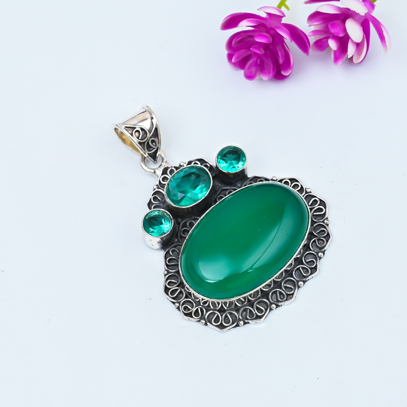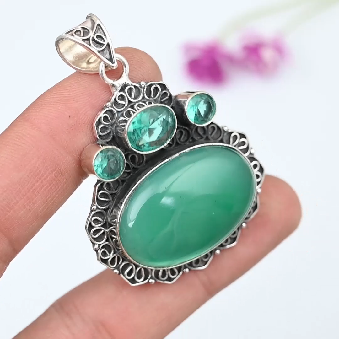 Natural Green Onyx and Apatite Pendant in 925 Sterling Silver