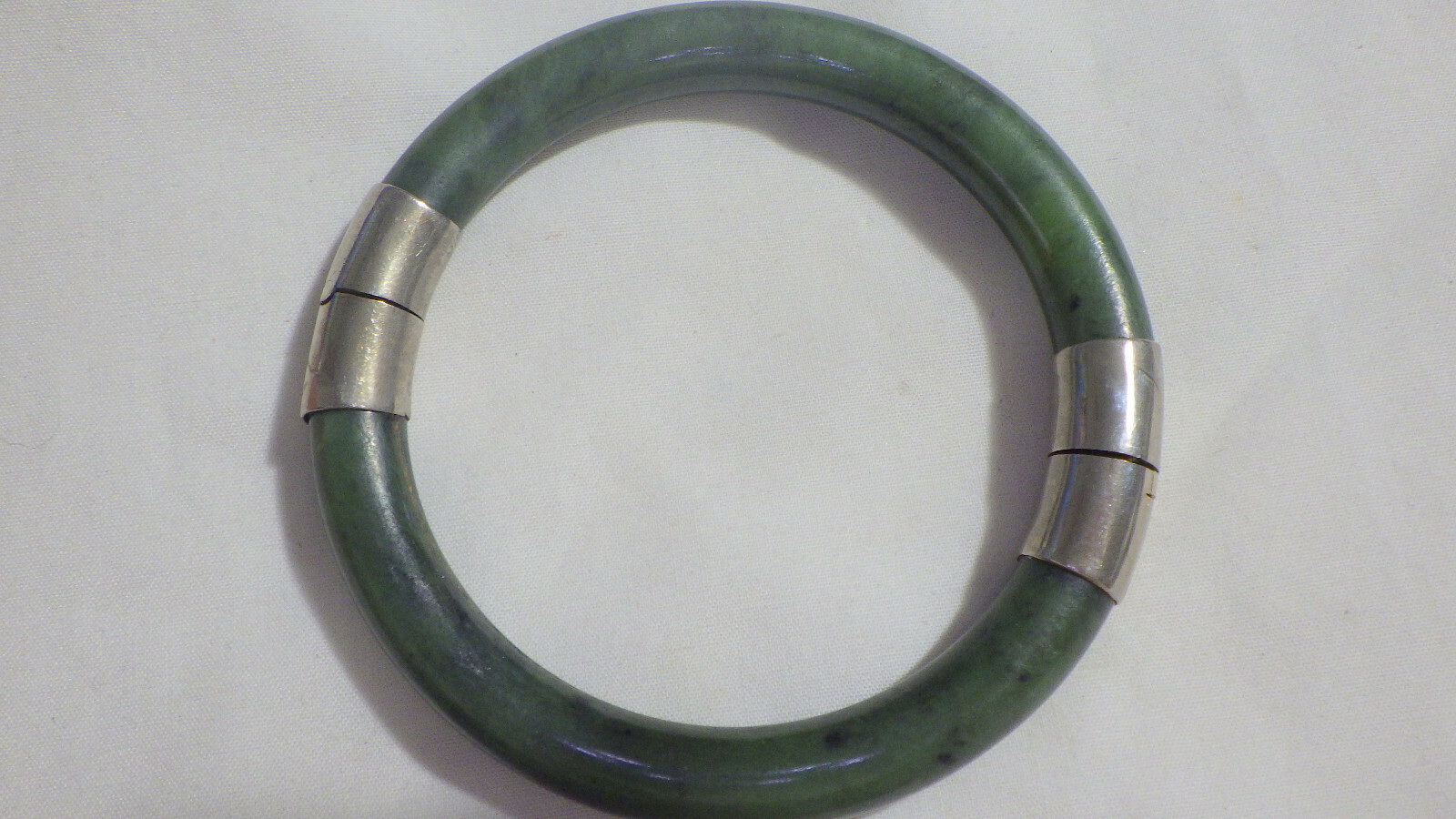 PRETTY NATURAL GREEN JADE BANGLE BRACELET W, SLIGHT DARK BLACK MARBLEING. STERLING CAPS , SIDE OPENING, GOOD PE OWNED CONDITION. WRIST OPENING STANDARD 2.5 INCH.