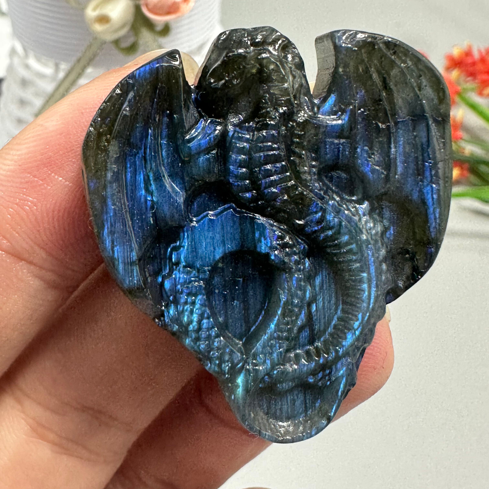 The color is beautiful in this stone. It is quite small, but the carving is good. Shipping was pretty fast. I like it. I may buy a couple more as additional gifts.